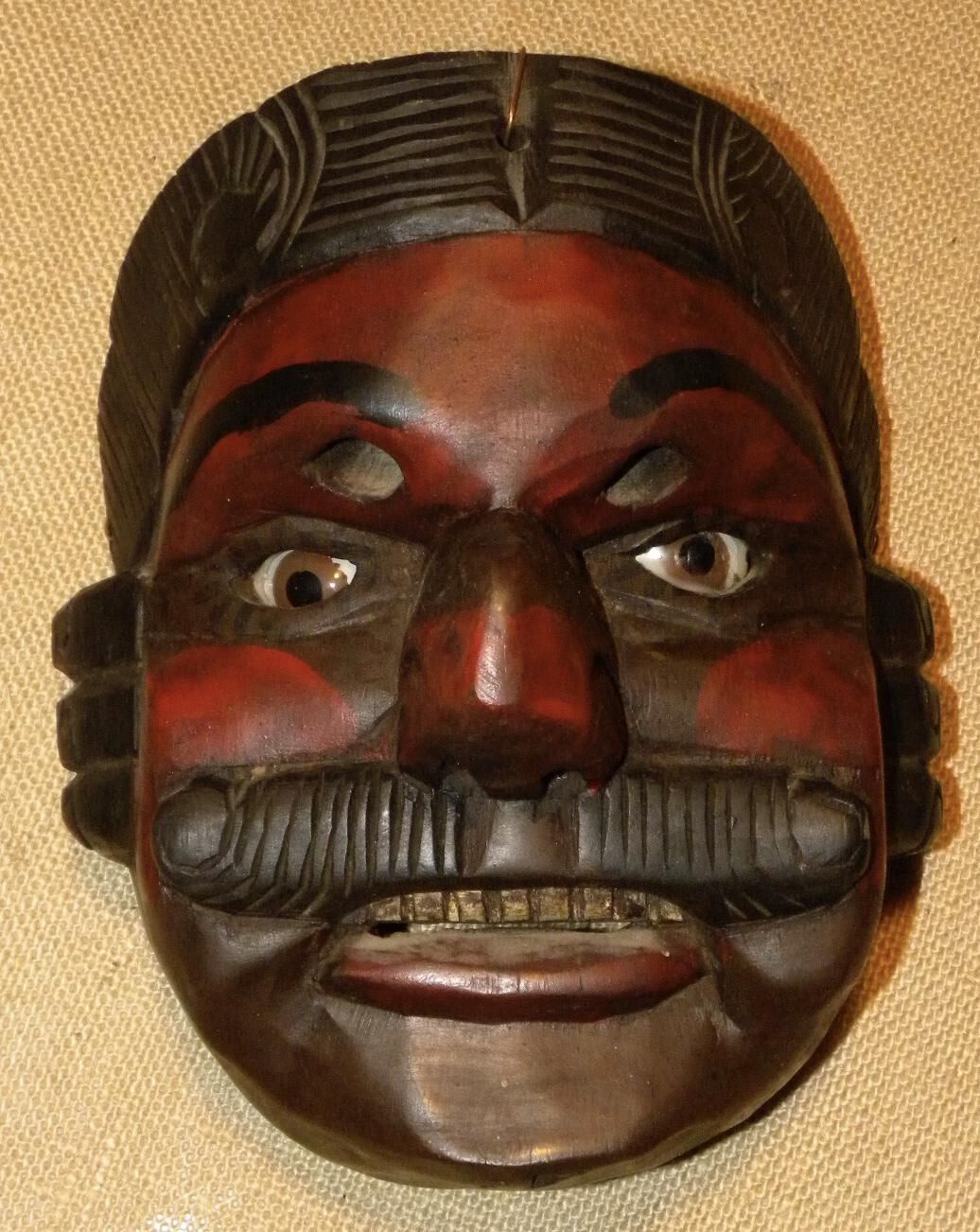 A life-sized round wood mask depicting a figure with a currant-red complexion and black designs. There is stylized black hair, sideburns, and parted mustache. A large nose is in between inset brown glass eyes and two cutout eyeholes for the wearer. A slightly open mouth showing a row of teeth. A wire is attached to the back.Context