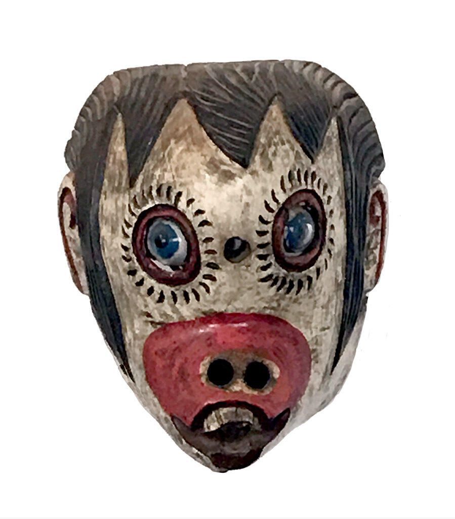 A life-sized rectangular wood mask depicting a monkey with a white face and dark brown hair. Inset blue glass eyes are encircled with a rose-red circle and brown lashes. One round cutout eyehole is between the eyes. A protruding rose-red nose has carved nostrils and an open, brown mouth with white teeth. A copper wire is attached to the back of the mask. Overall scratch marks and paint loss.Context