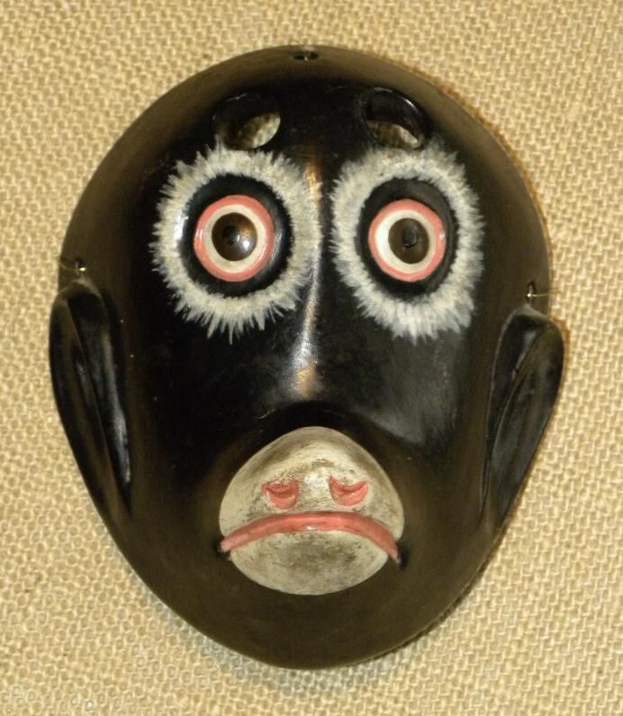 Small circular wood mask depicting a monkey with a black face. The brown eyes are wide and outlined with coral-pink circles and white feather-like brushstrokes. Two cutout eyeholes for the wearer are above the painted eyes. A narrow white snout protrudes from the face and has coral-pink nostrils and a frowning mouth. A wire is attached to the back of the mask. Very good condition except for some paint loss on the nose.Context