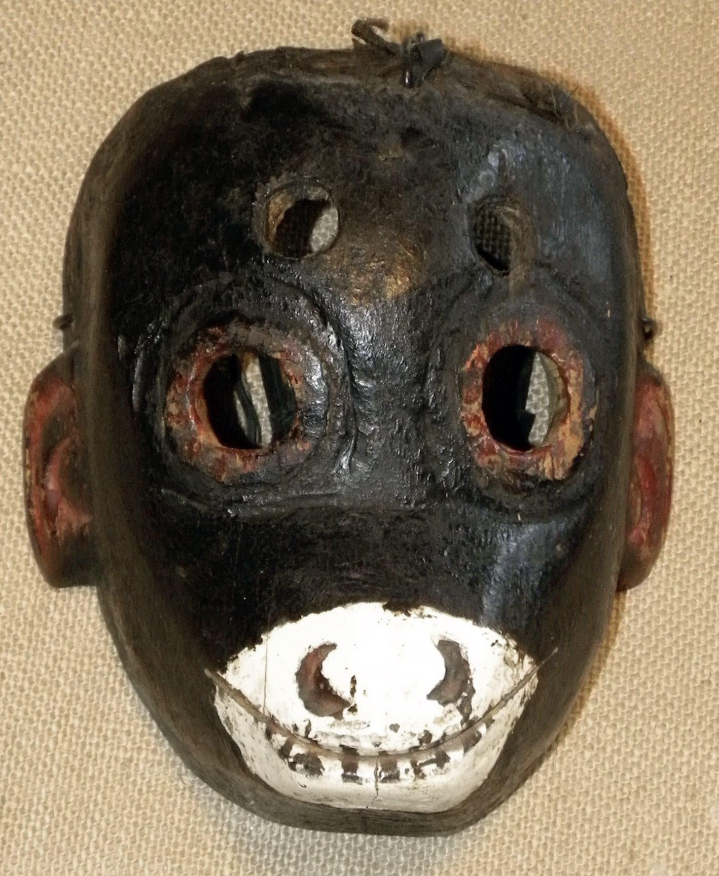 A life-sized oval wood mask depicting a monkey with a dark brown face. Two circular cutout eyeholes are on the forehead. Another set of cutout eyeholes outlined with brown. Two ears extend from the side of the head. A white muzzle extends from the face and has carved nostrils and teeth. A wire and rubber are attached to the back for the mask. Overall signs of pigment loss.Context
