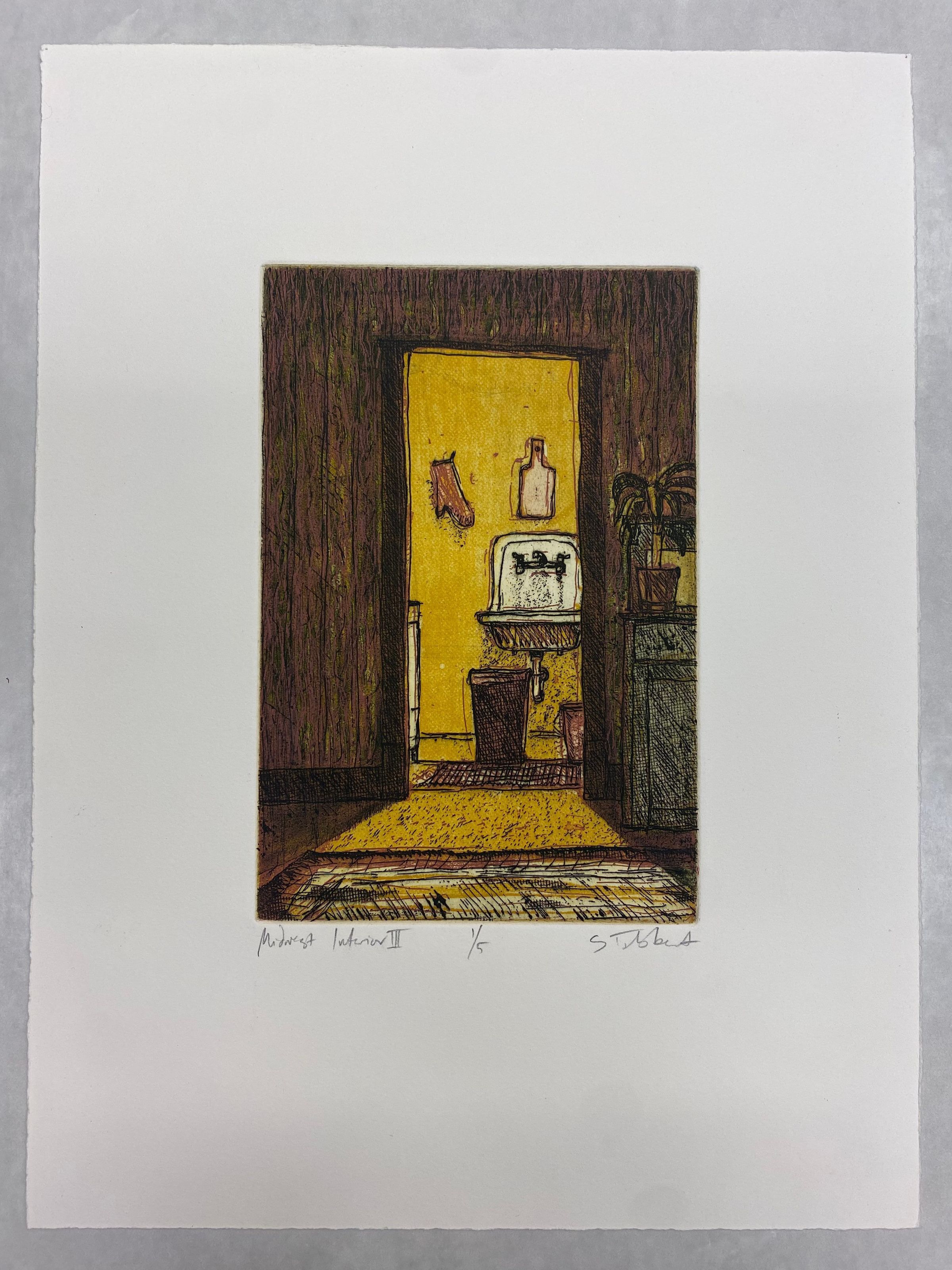 A medium vertically oriented print depicting an interior domesticated yellow space. The viewer perspective puts spectators looking at a brightly lit room from a different space, emphasized by the doorframe and contrasting light between the rooms. A sink, oven mitt, trashcan, and hanging cutting board can be viewed from the other room, while spectators are in a darker space furnished with a carpet on the foreground and shelve unite with potted plant to the right.