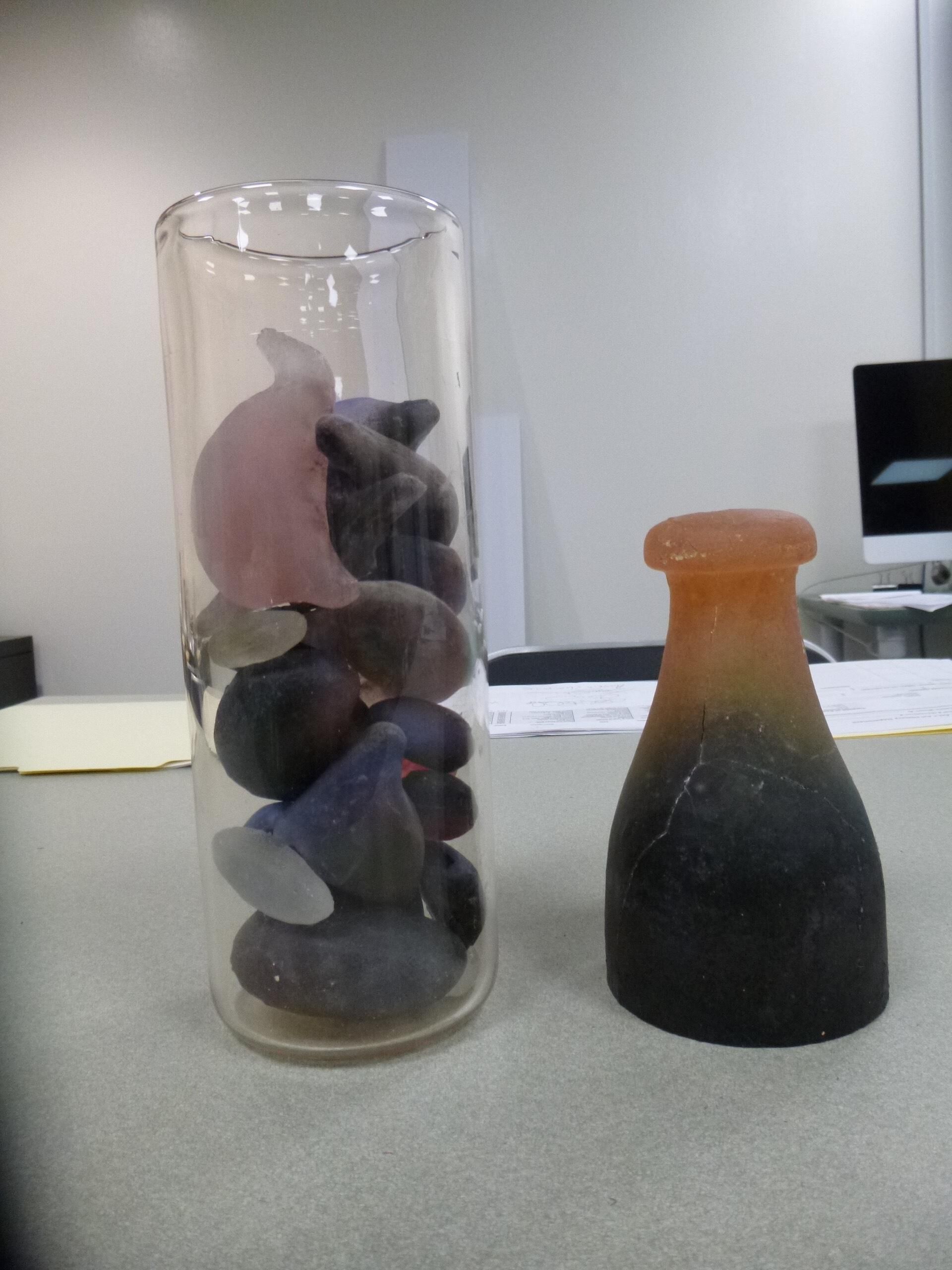 A two-piece artwork featuring a clear glass cylinder with approximately 25 stones inside, and a bottom-heavy bottle-shaped piece of cast glass.Collection
