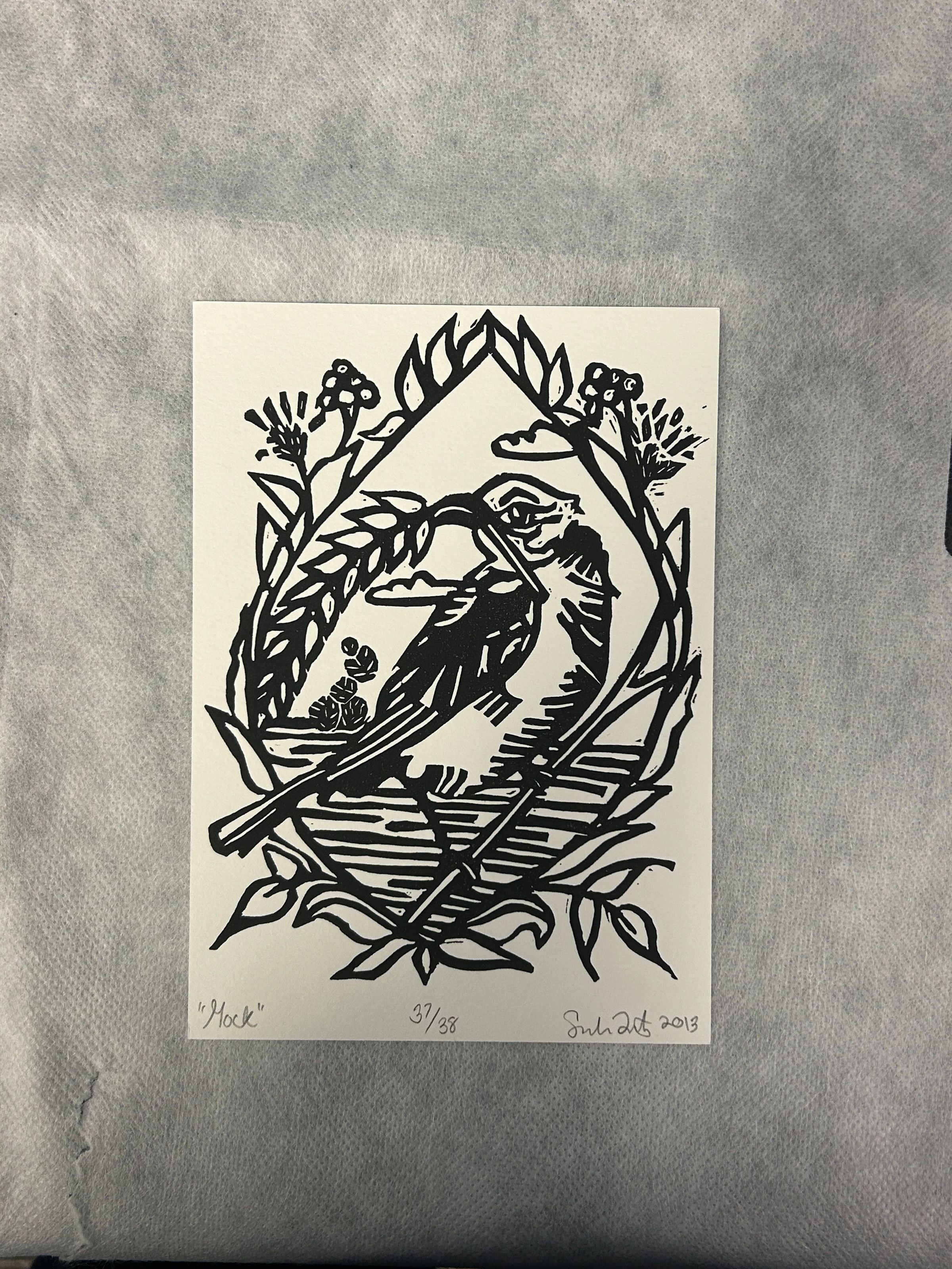 A small black and white print of a bird holding a piece of wheat in its mouthCollection