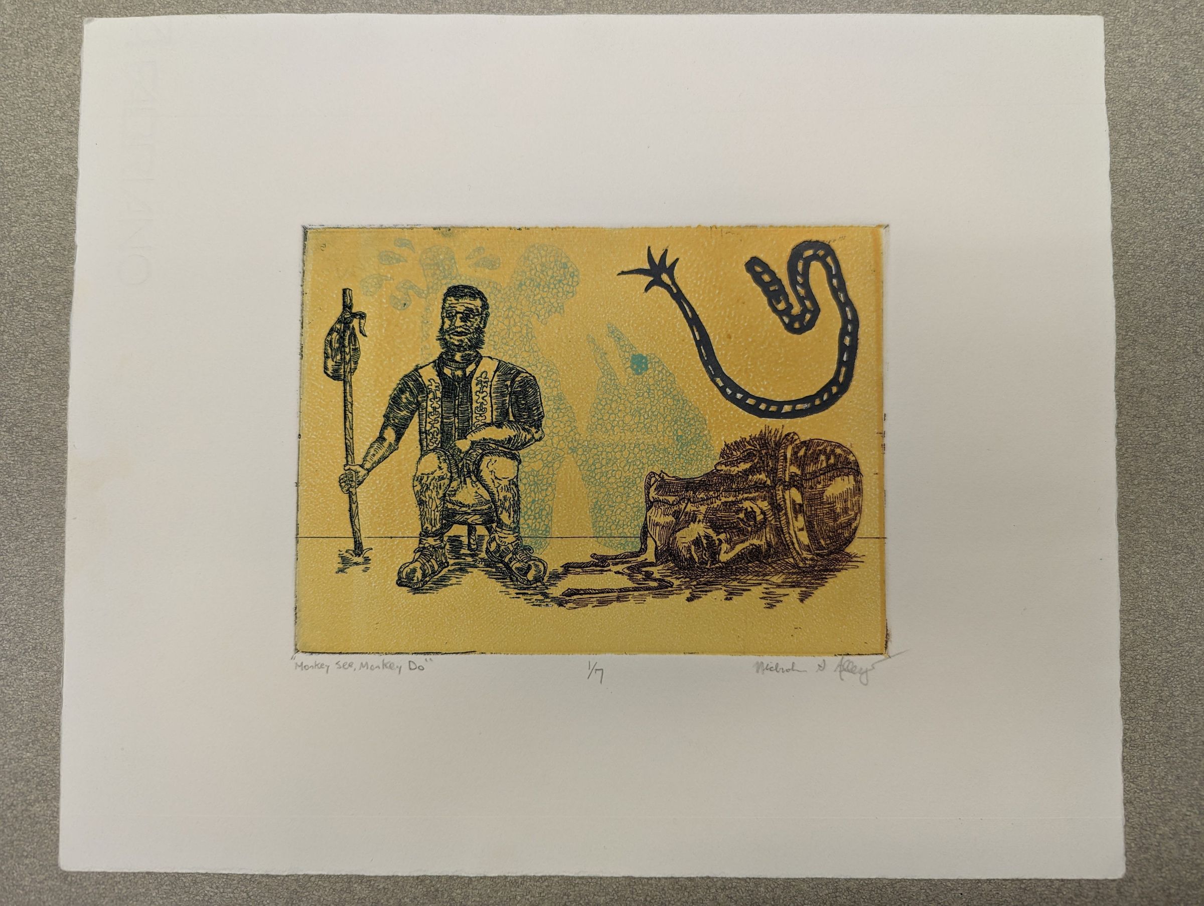 A print of a bearded man with glasses sitting on a stool and holding a sack on a stick. Beside him, a large disembodied head lays on the ground. Above it is printed the image of a whip. The background is yellow, and laid in the background are the squiggly green silhouettes of a headless body and a head looking down at an open-mouthed creature.Context