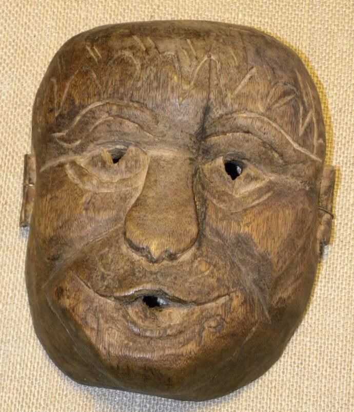 A life-sized square wood mask depicting a man with incised eyebrows, wrinkles, and hairline. There are triangular eyeholes cut into carved eyes. The nose is flat. The mouth is pursed with a small cutout opening. A wire is attached to the back of the mask. There are some minor cracks in the chin.Context