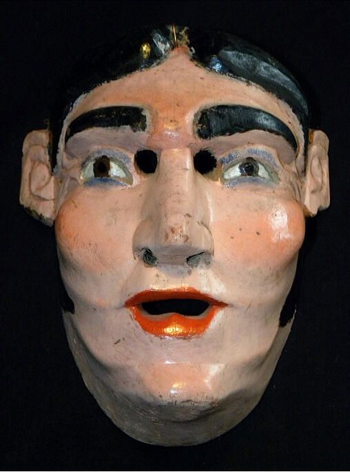 A life-sized oval wood mask depicting a woman with an ivory complexion and light peach blush accents on cheeks, forehead, and chin. The hair is black and goes down onto the cheeks. Black eyebrows are over cutout eyeholes for the wearer and painted black eyes outlined with blue. A concave nose is above an open red mouth. A wire is attached to the back of the mask. Various signs of scratches and paint chipping.Use