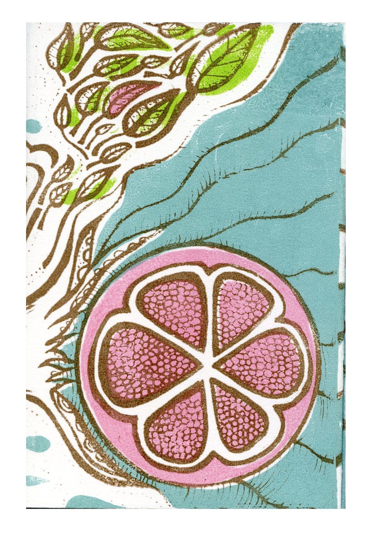 The cover has the depiction of flowing green and pink leaves and a pink pomegranate on the front. On the back there is a green plant. All the images are outlined in brown ink and there is teal on the clouds and the raindrops of the image.Collection