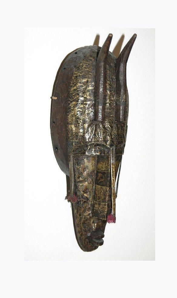 Horned face mask with large forehead and elongated face, covered with embossed brass sheets and decorated with red string tassels at the end of the nose and ears.Collection