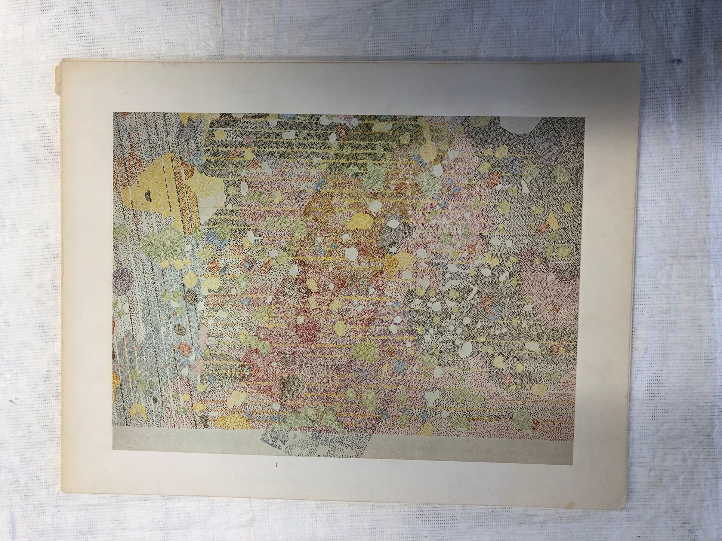 A large, thin, white book with a speckled and striped multicolor artwork central on the front page. The interior contains an exhibition catalogue detailing the artist and her work, the images in color.Collection