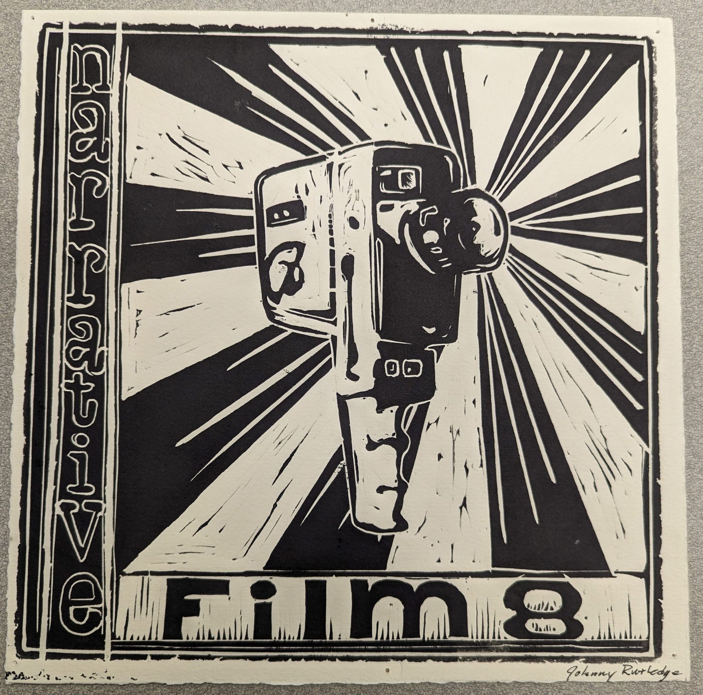 A print of a cartoon-style handheld camera titled "Narrative Film 8."Collection