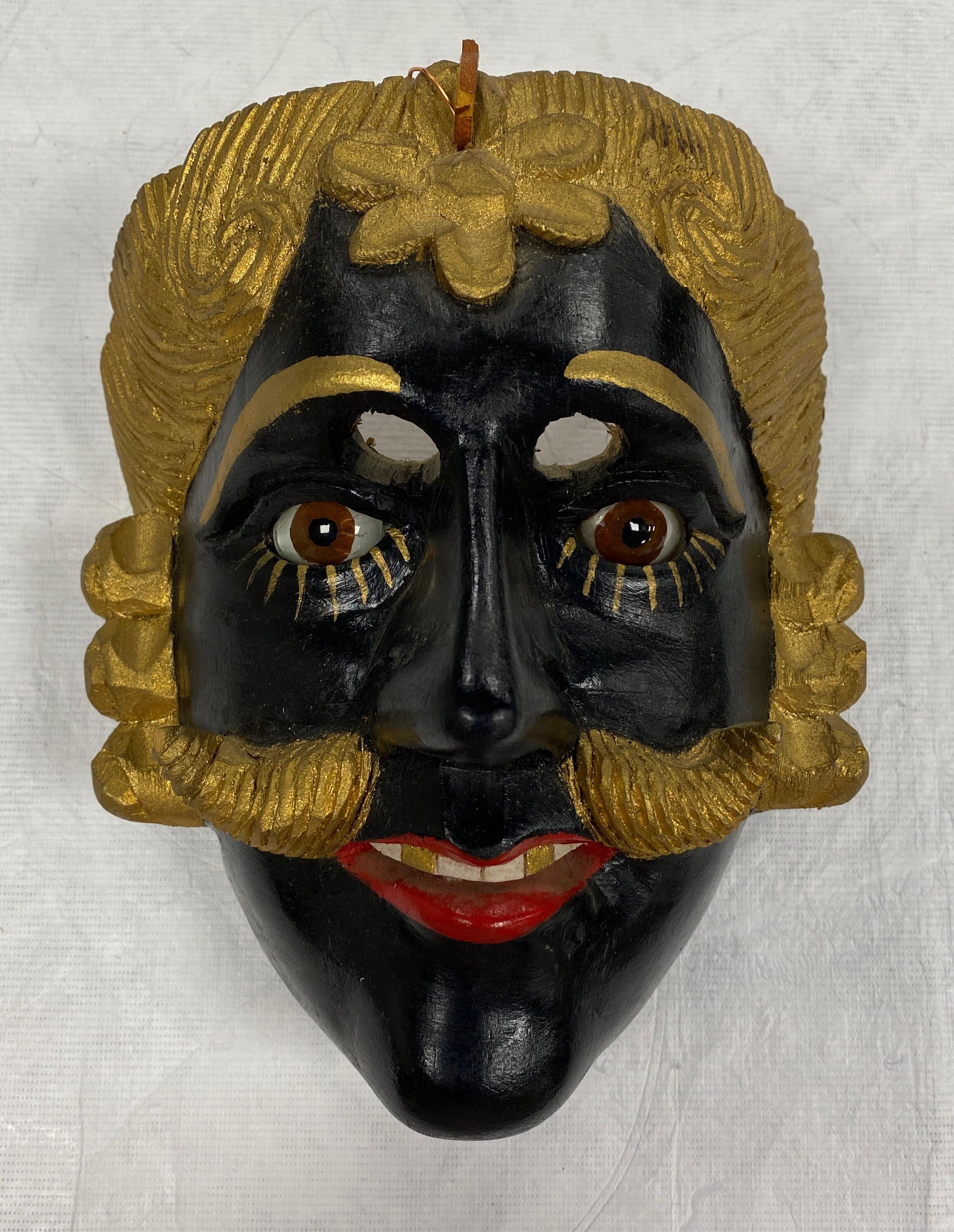 A life-sized diamond face-shaped wood mask depicting a man with a shiny black complexion. There are gold details including eyebrows, painted eyelashes, and stylized hair that leads into curled sideburns and a parted mustache. The hair is decorated with a gold flower centered on the forehead. There are two inset brown glass eyes below cutout eyeholes for the wearer. The mouth is parted with red lips and white and gold teeth. A copper wire and a piece of leather string are attached to the back of the mask. The mask is in excellent condition.Context