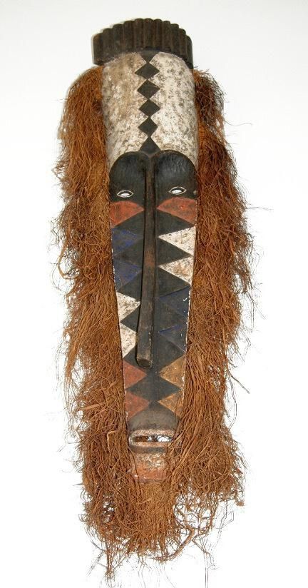 Elongated wooden face mask with arched brows, long nose, polychrome geometric design, and plant fiber hair and beardContext