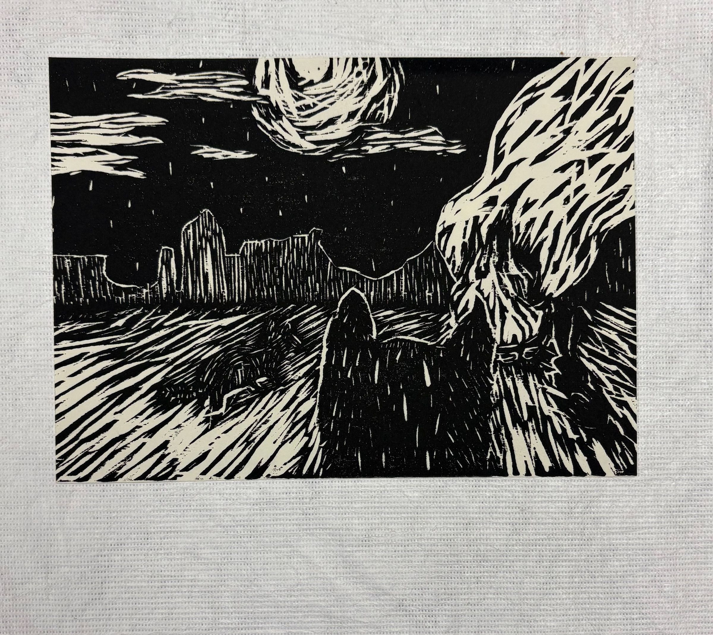 A small, horizontally oriented print that is done on a white/cream colored ground with black ink. The print depicts a night scene of a desert landscape with animal figures and rock formations.Collection