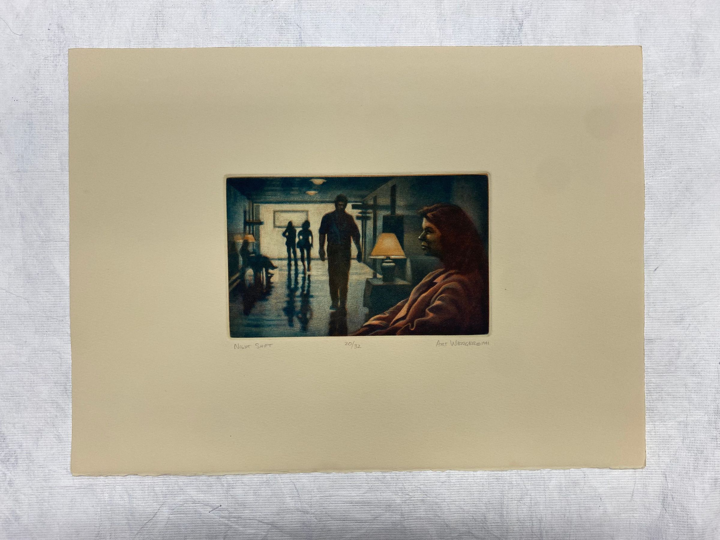 Medium-sized mezzotint print of people in a dim hallway in the evening with lamps on tables providing light with the brighter light at the end of the hall in the background. In the foreground on the right, a woman is seated in profile, and a male figure is rendered in motion walking toward the foreground. Only a portion of the male figure’s face can be made out the rest of the form is dark. In the background on the right, there is another seated female figure in profile, but she is dark only silhouetted. To the right of that figure, close to the center of the composition in the background, are two additional female figures silhouetted against the light.