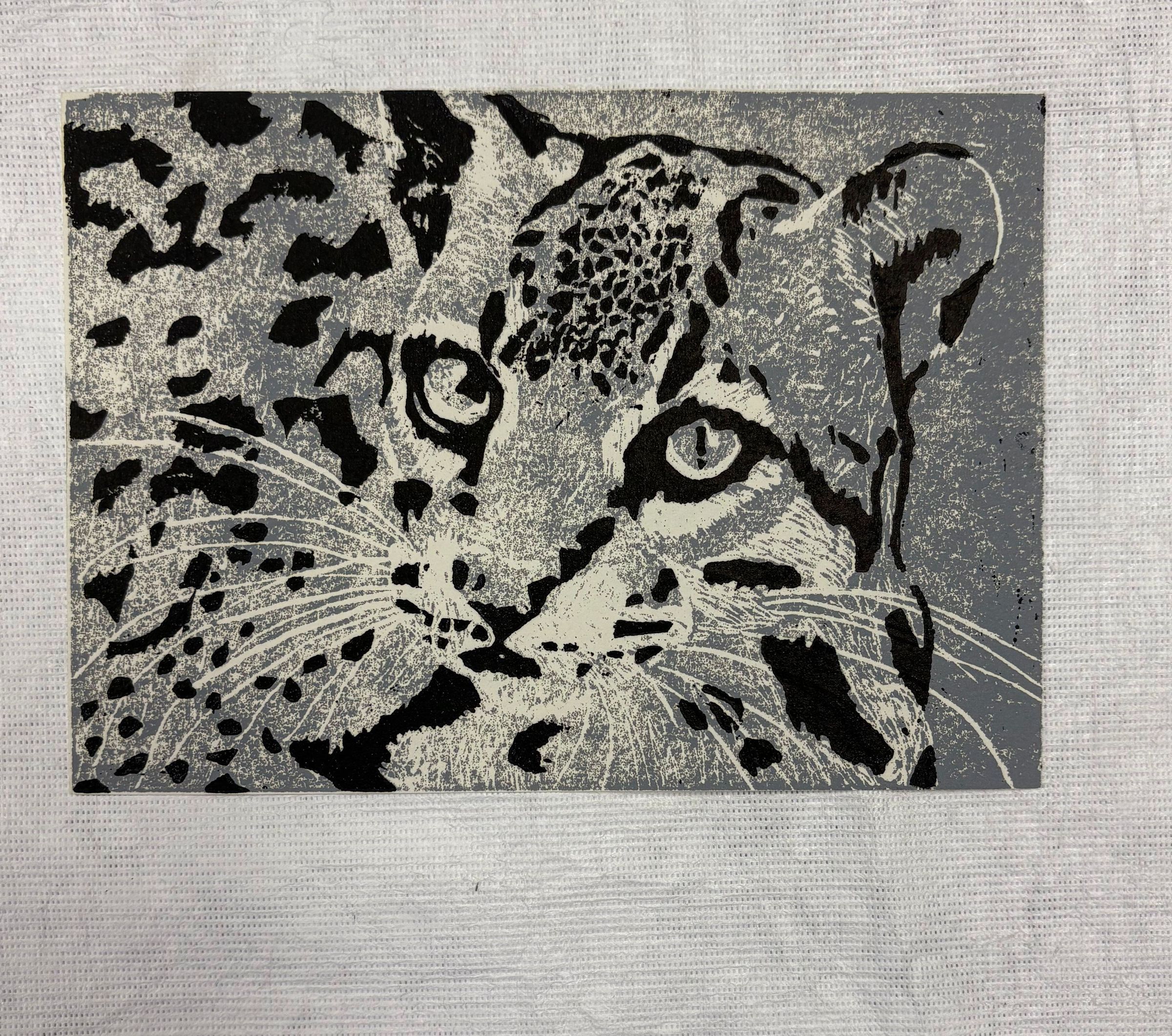 A small, horizontally oriented print that is done n a cream colored ground with black, white and grey pigment. A large majority of the print is occupied with the image of an ocelot with its distinct patterning as it looks out toward the viewer.Collection