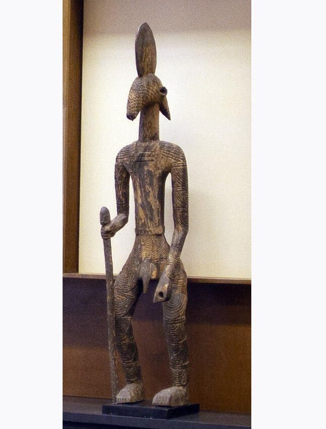 Large wood carving of human-animal composite figure holding a staff and with elongated head with vertical crest.Collection