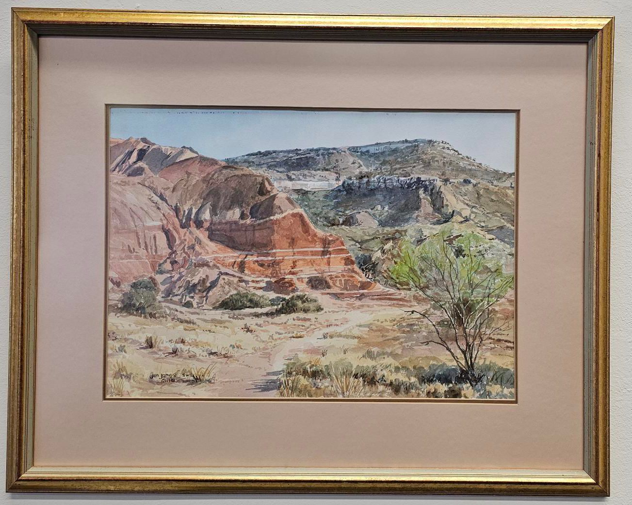 A medium horizontally framed watercolor painting depicting the Palo Duro Canyon in Texas. Desert canyon with a small tree in the lower left and cliff sides on the central right.Made/Created