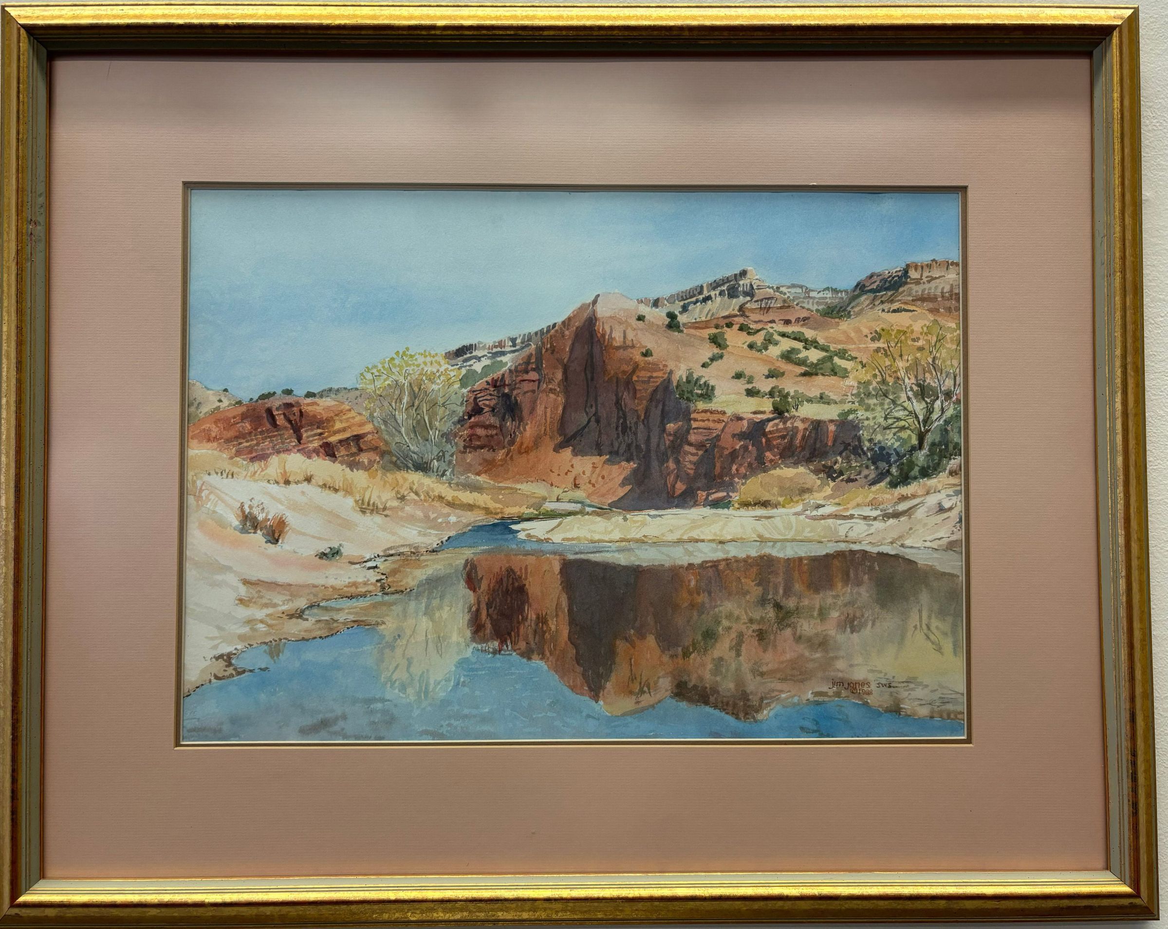 Large horizontally positioned watercolor painting that displays a landscape with a red painted mountain reflected in a blue lake.Collection