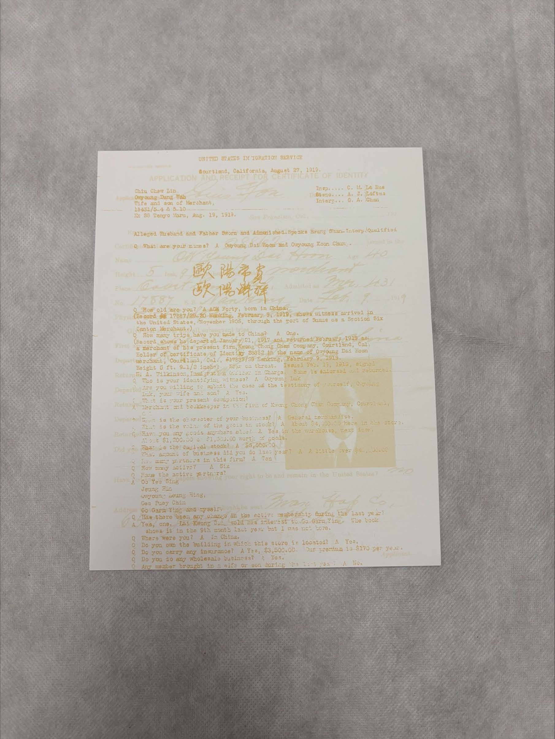 A vertically oriented, medium sized print done on a white/cream paper with tones of yellow text. The print is composed primarily of text that is formulated to mimic the design of immigration papers, With a small portrait photo near the bottom proper left corner.Collection