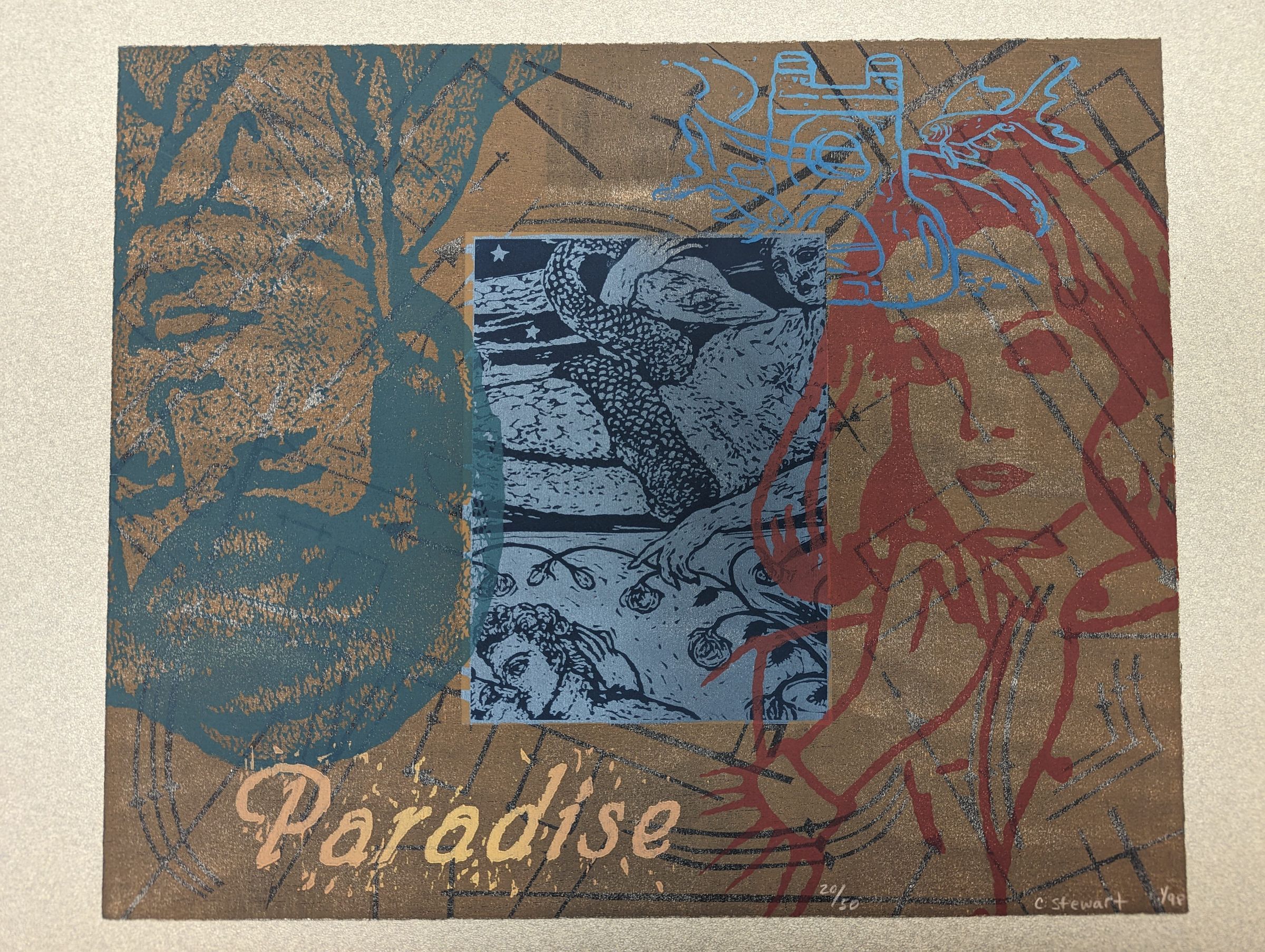 A print of a brown background overlaid with separate bits of imagery: a woman in red on the right, an upside-down man in blue on the left, a fish and structure near the top right, text saying "Paradise" at bottom left. Centered is a scene in blue of people kissing, a snake, an outstretched hand, etc.Context