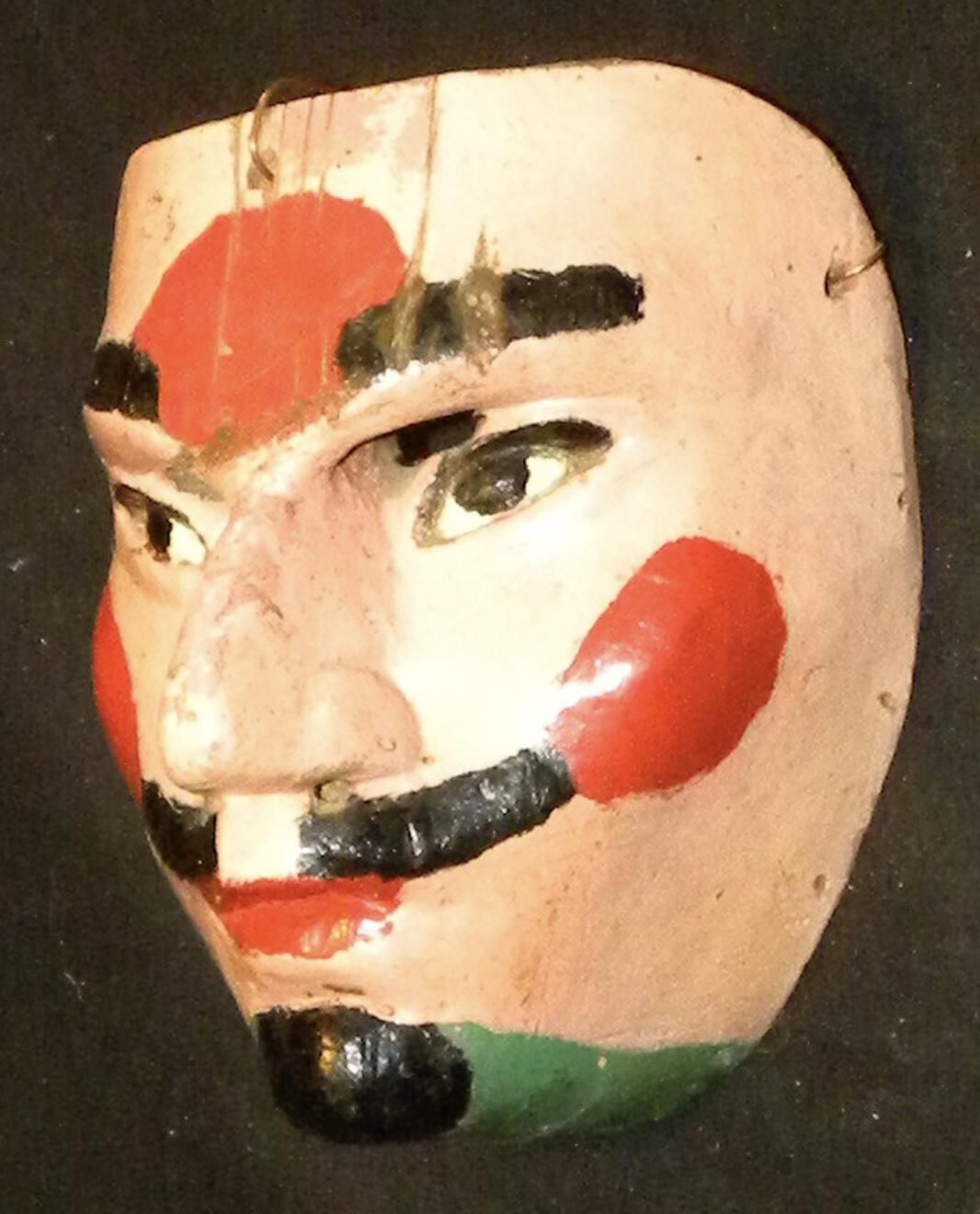 A life-sized triangular wood mask depicting a figure with an ivory complexion and red circles on the forehead and cheeks. Painted black eyebrows are above cutout eyeholes for the wearer and painted black eyes. A large nose is above a black parted mustache and a closed red mouth. A black goatee on the painted green chin. A copper wire is attached to the back of the mask. Other holes line the bottom half of the mask. Large cracks on the chin and forehead.Context
