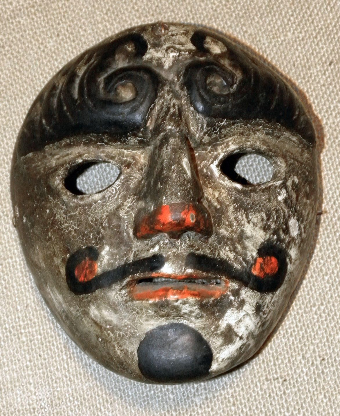 A life-sized circular wood mask depicting a man with a white face. Two oval cutout eyeholes are under large, stylized black eyebrows. A red-tipped straight nose is above a black mustache that curls around red cheek circles. The red mouth is parted and above a black goatee. A wire is attached to the back of the mask. Overall signs of paint loss and muddled texture.Context