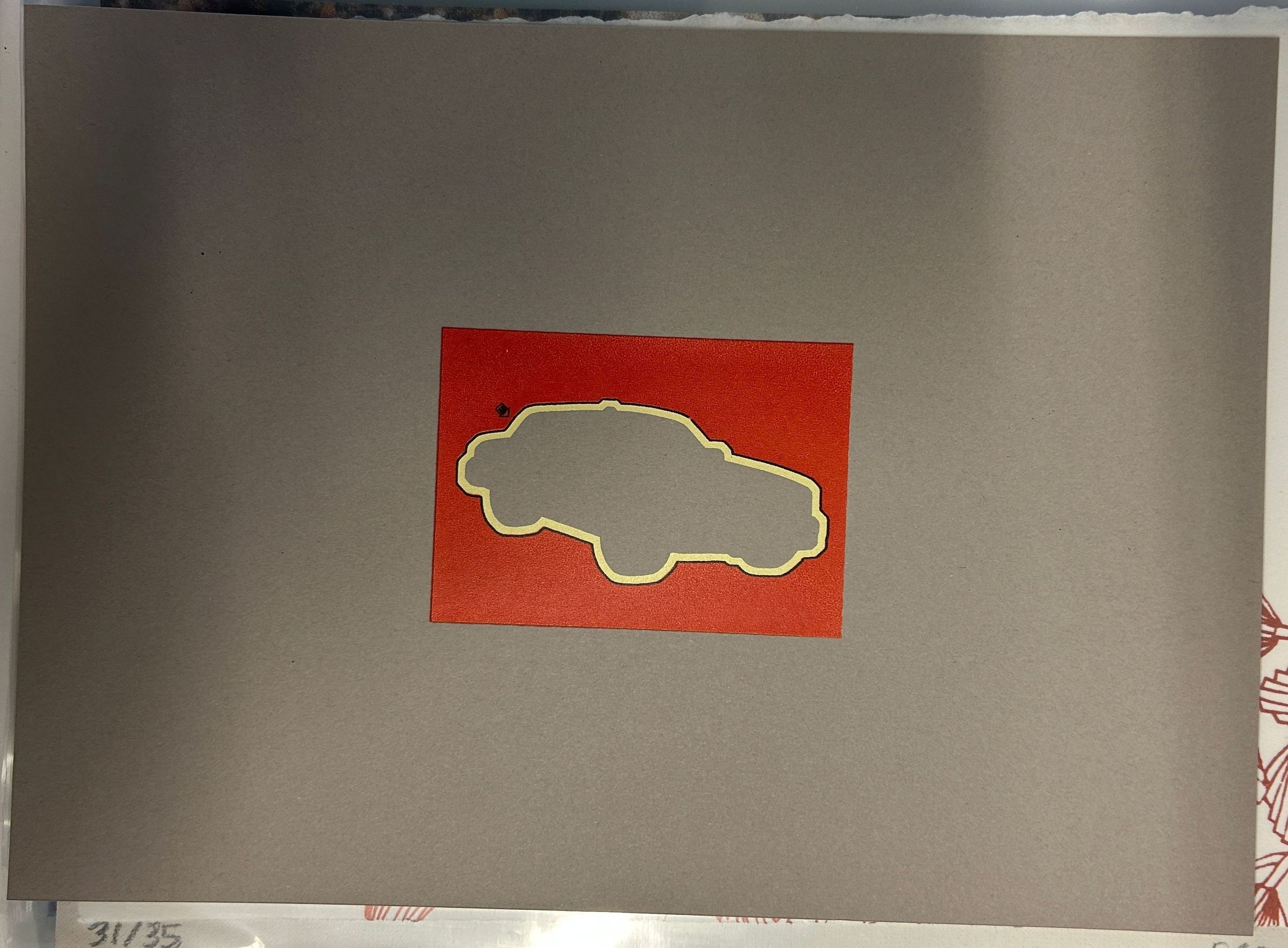 A small print of an outline of a car in a red rectangle.Collection