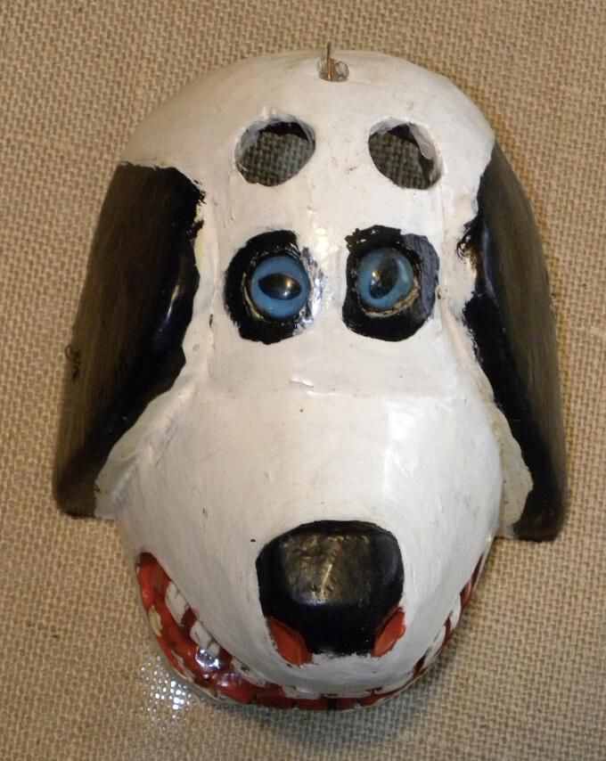 A life-sized oval wood mask depicting a white dog with black ears. Two inset blue eyes encircled with black. Two cutout eyeholes for the wearer on the forehead. A black painted nose with red nostrils on the end of a protruding muzzle. An open red mouth with white teeth. A wire is attached to the back of the mask. Some pigment loss and a split in the mouth.Context