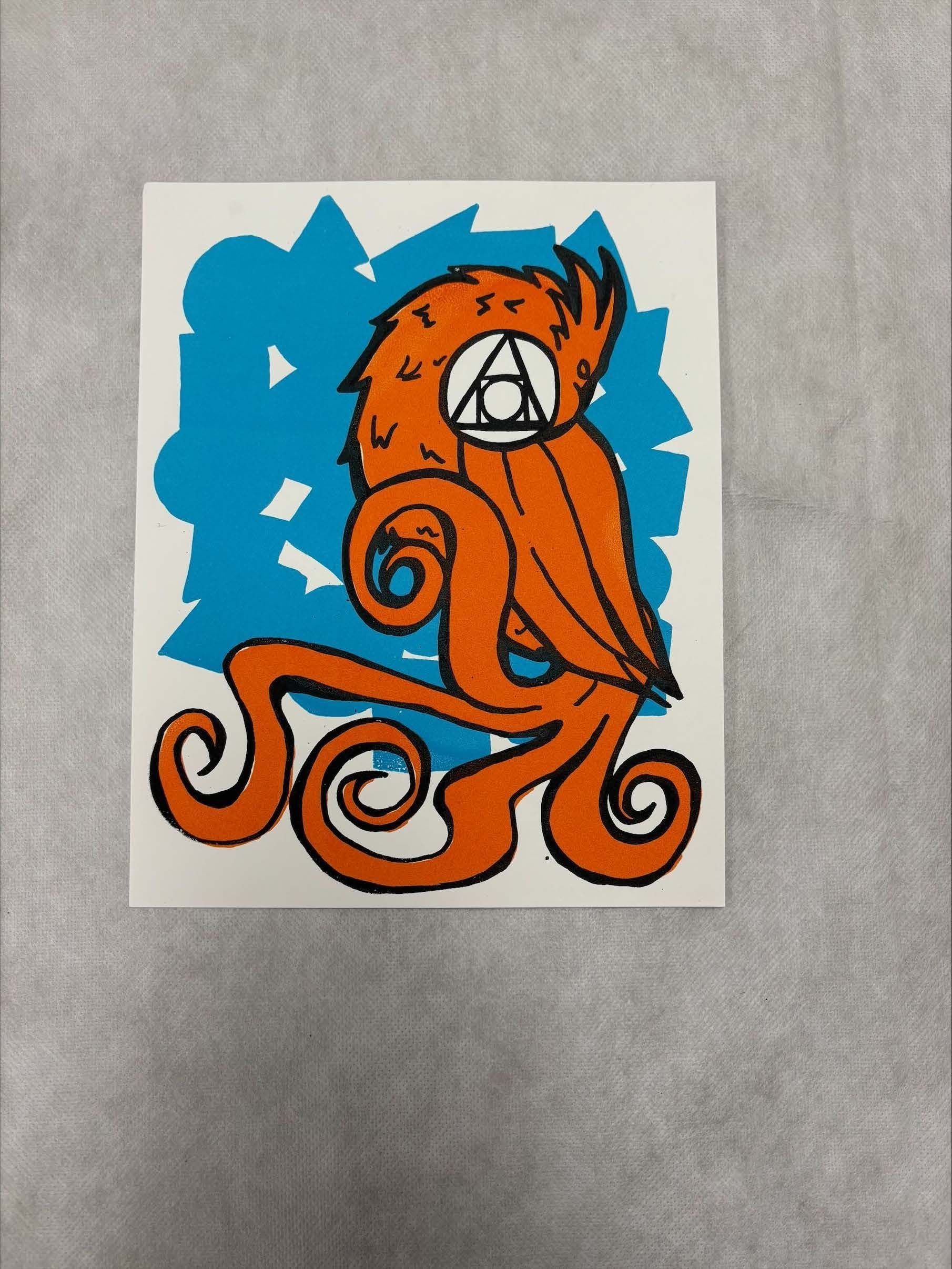 A vertically oriented, medium sized print that done on white paper with primarily orange and blue pigment, with black used to outline the main figure. The image of a phoenix is placed over an abstract blue background that is an amalgamation of undefined shapes. The phoenix itself is outlined in a thick black pigment and encircles a geometric symbol around its head.