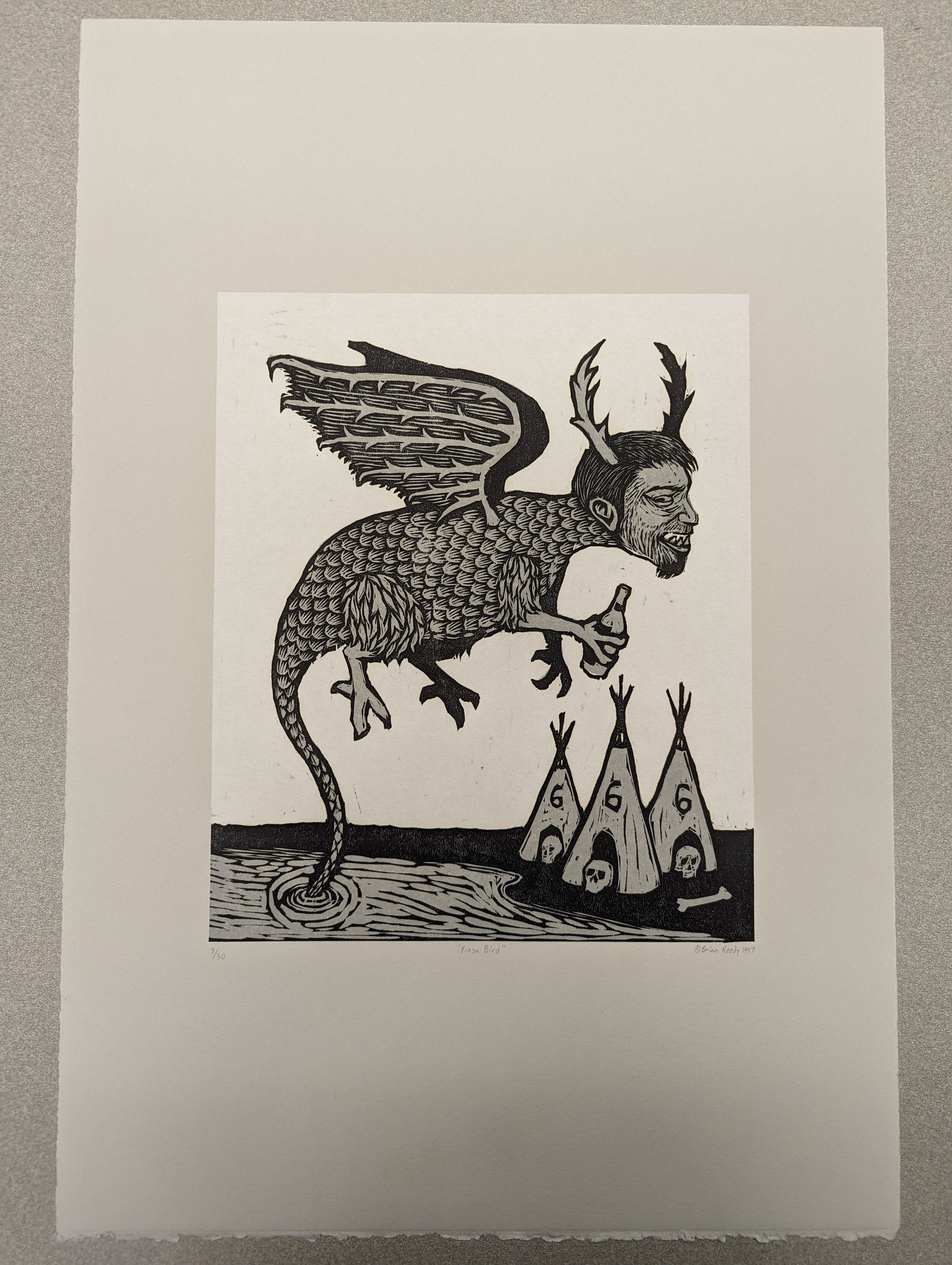 A black and white vertical print showing a chimeric monster (a scaled, winged creature with a man's head and antlers) holding a bottle and flying over three tipis with a "6" on each of them and skulls inside them.Context