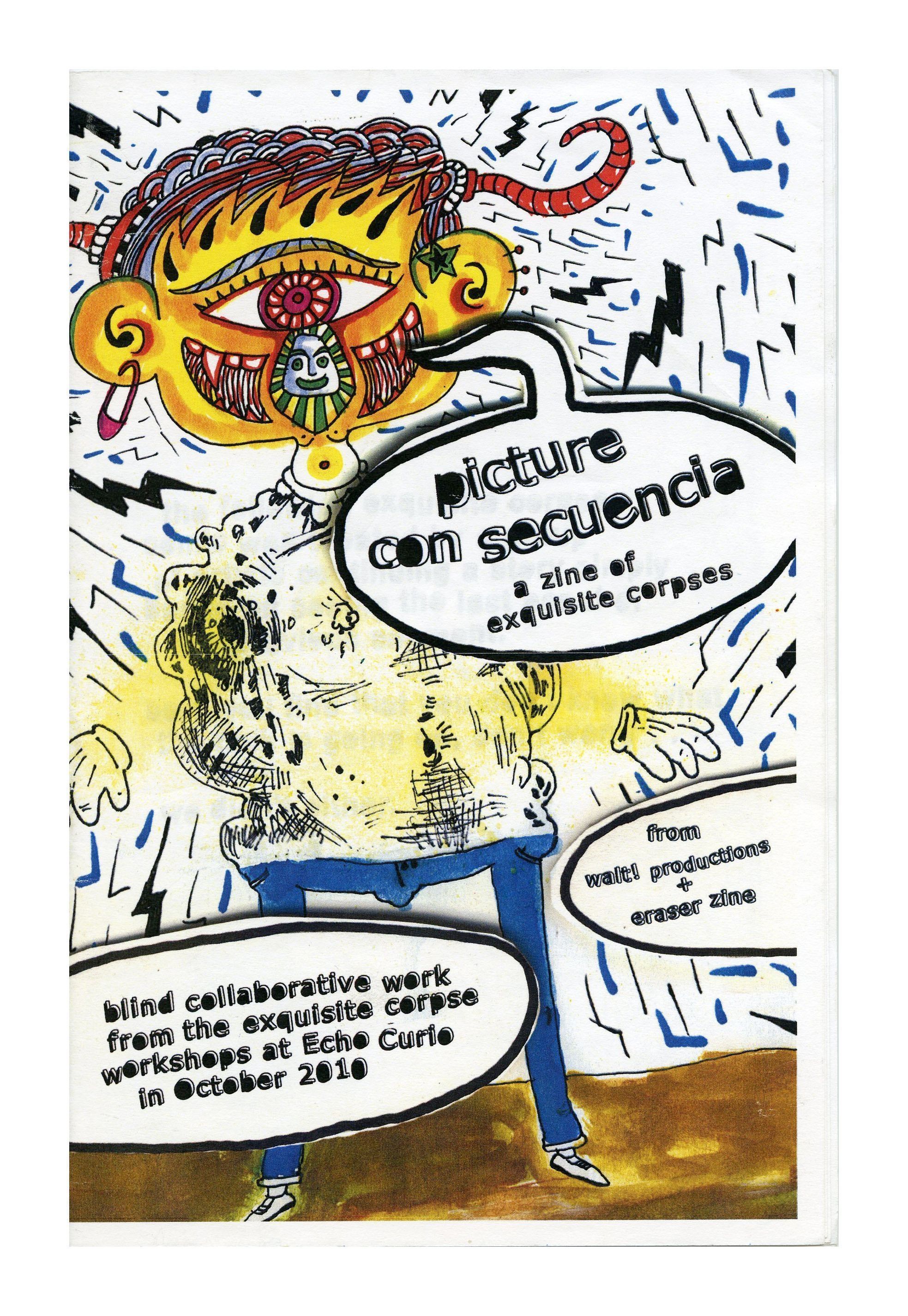 Small white paper booklet with a large full-body illustration of a yellow-faced, red one-eyed smiling character, surrounded by dialogue bubbles with texts. The "armless," meteor bodied character stands on a brown foreground with an arrangement of black lightning bolts and other black and blue line art on a white background.Collection