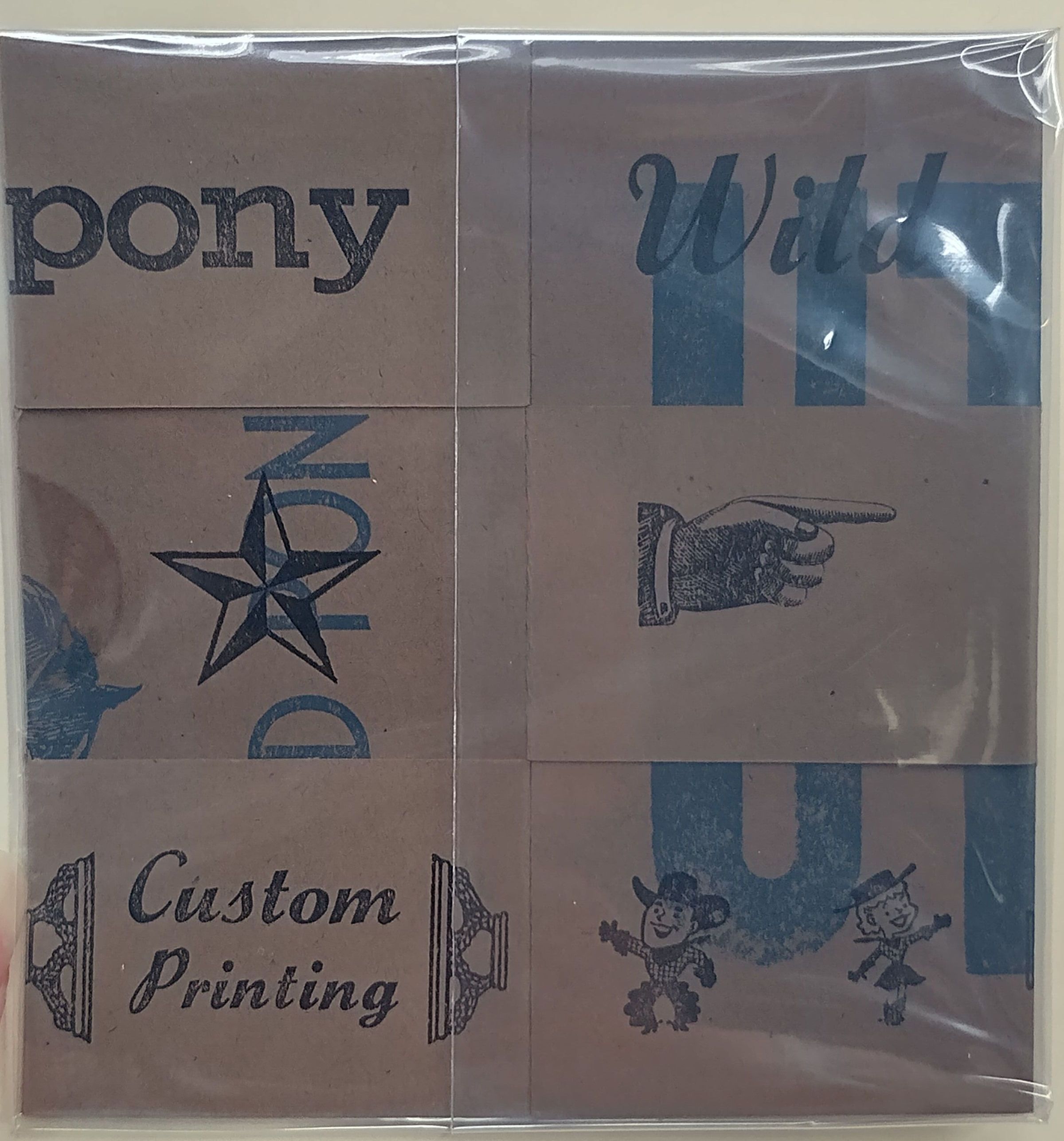 Small brown card paper booklet cut and folded to create six sections (2 columns of 3 rows) of abstract collage from different printed stamps depicting Western culture, University of Texas at Arlington (UTA), and other illustrations on both sides.Collection