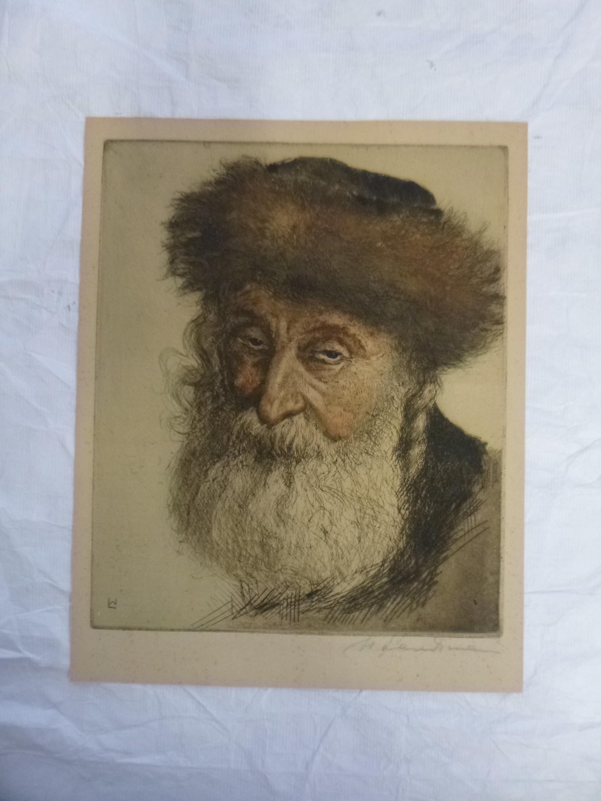 Small, vertically-oriented print of an old bearded man wearing a fur hat, called a shtreimel.Collection