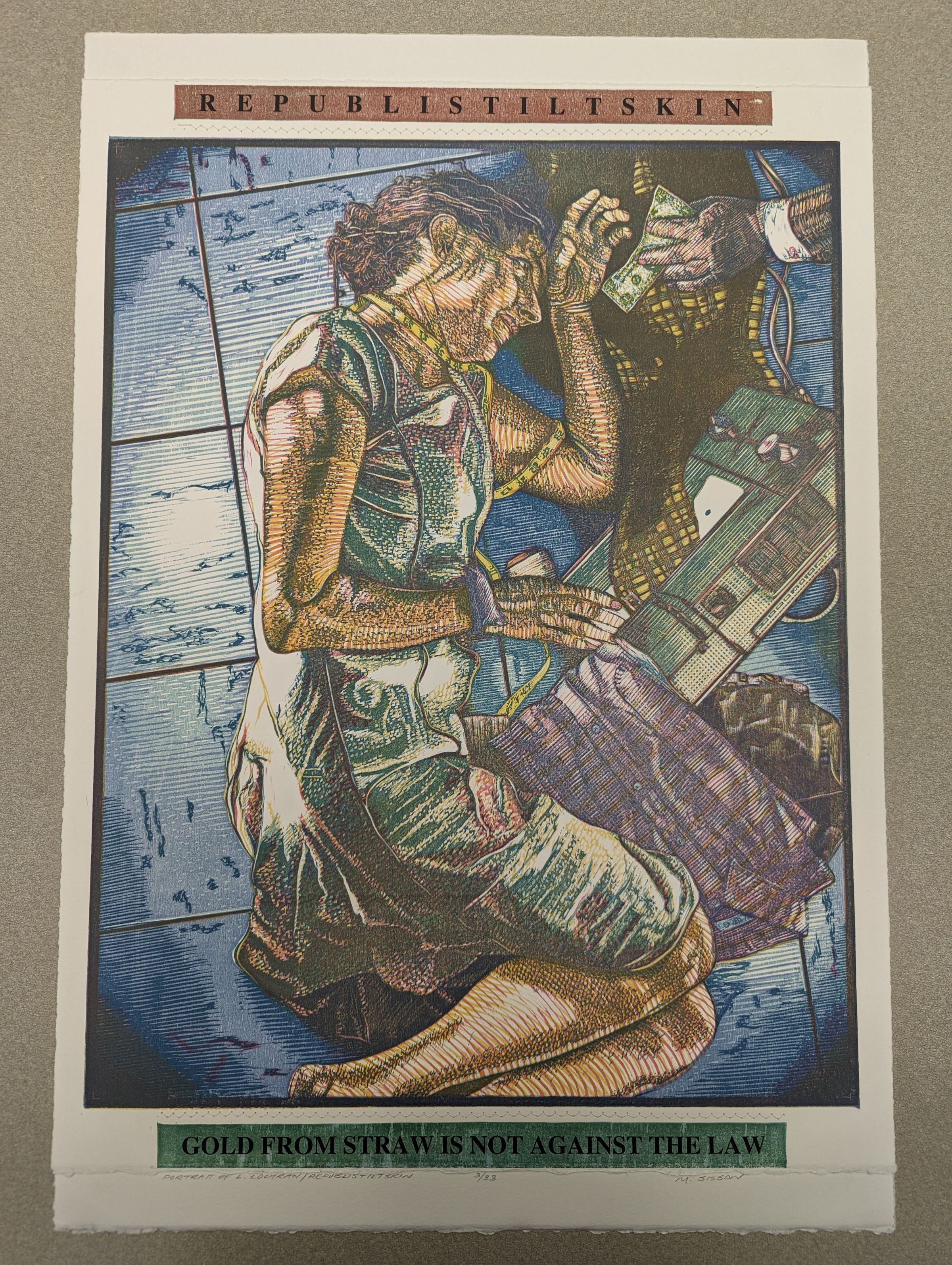 A large vertical print showing a woman in a dress with a tape measure around her neck and arm, tending a box from which clothes are fabrics are coming out of and receiving money from an outstretched hand. The background is a blue grid, possibly windows. The words "REPUBLISTILTSKIN" are printed above it, with "GOLD FROM STRAW IS NOT AGAINST THE LAW" below it.Context