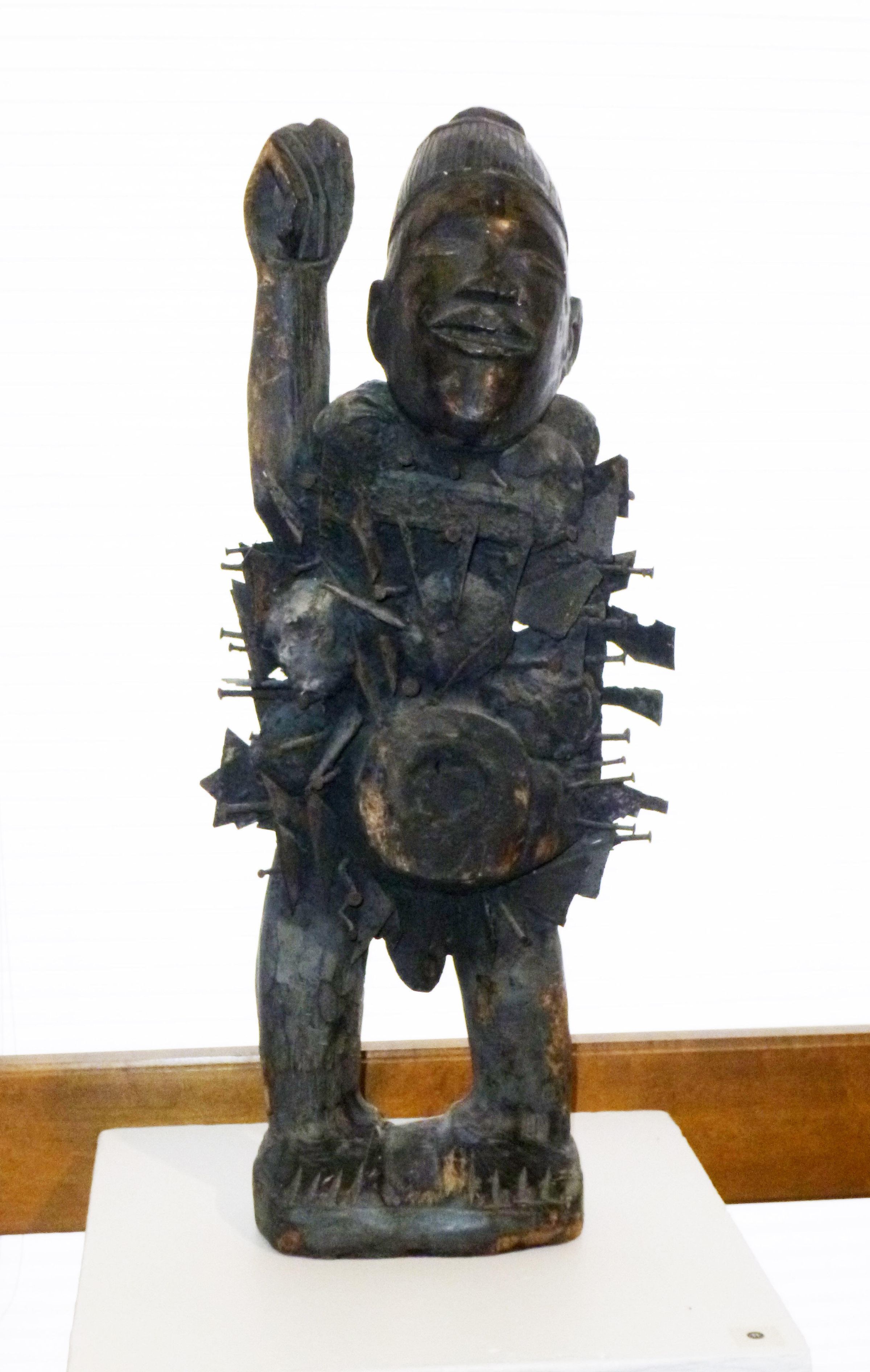 Carved wood standing male figure with one raised arm and with shards of metal and nails embedded in the torso, as well as cloth parcels containing ritual materialsCollection