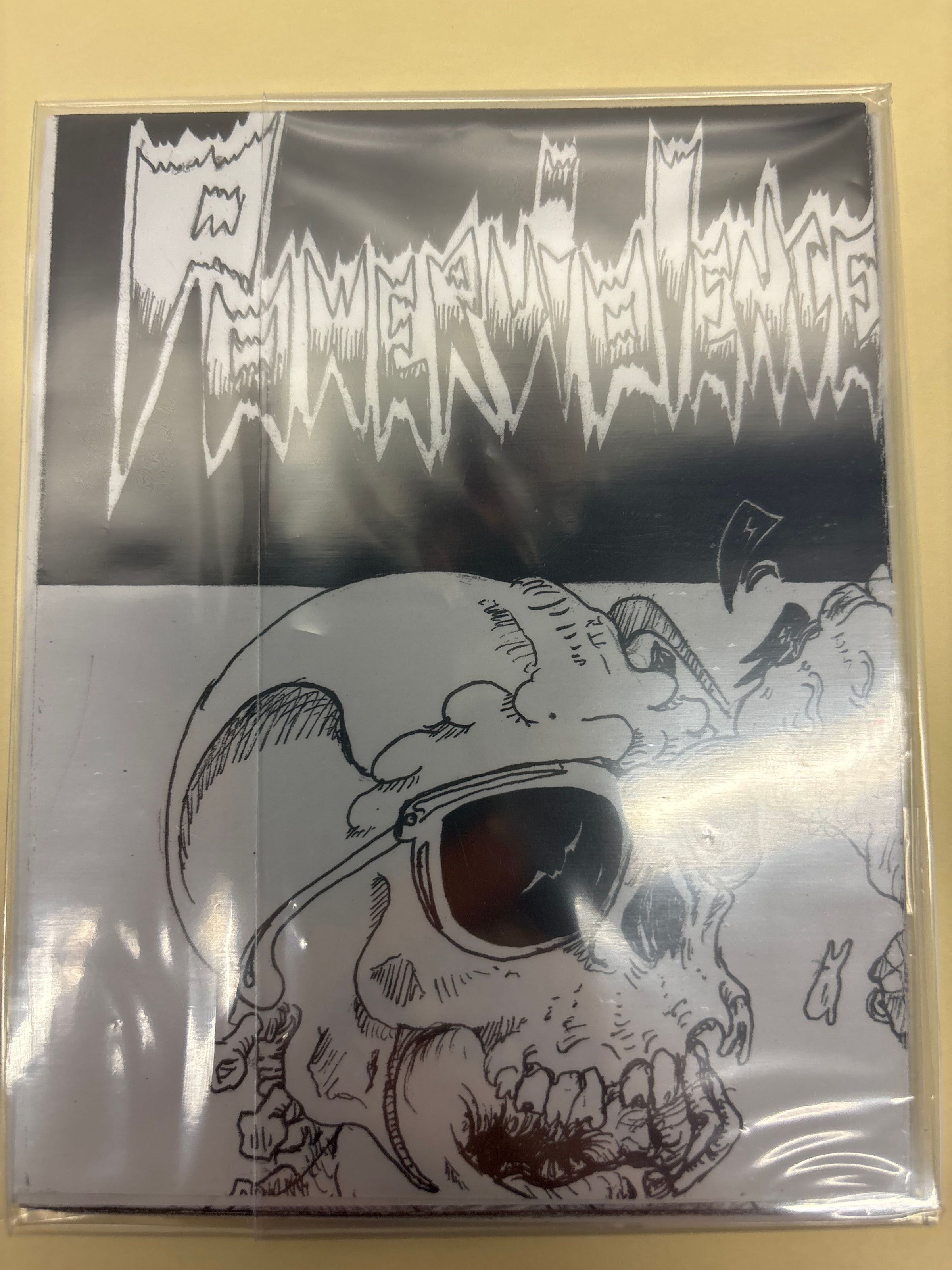 The small book is black and white featuring black pen. The front cover has a drawing of a broken, rotting skeleton wearing broken sunglasses. The title is above the skull in a graffiti style print.Collection