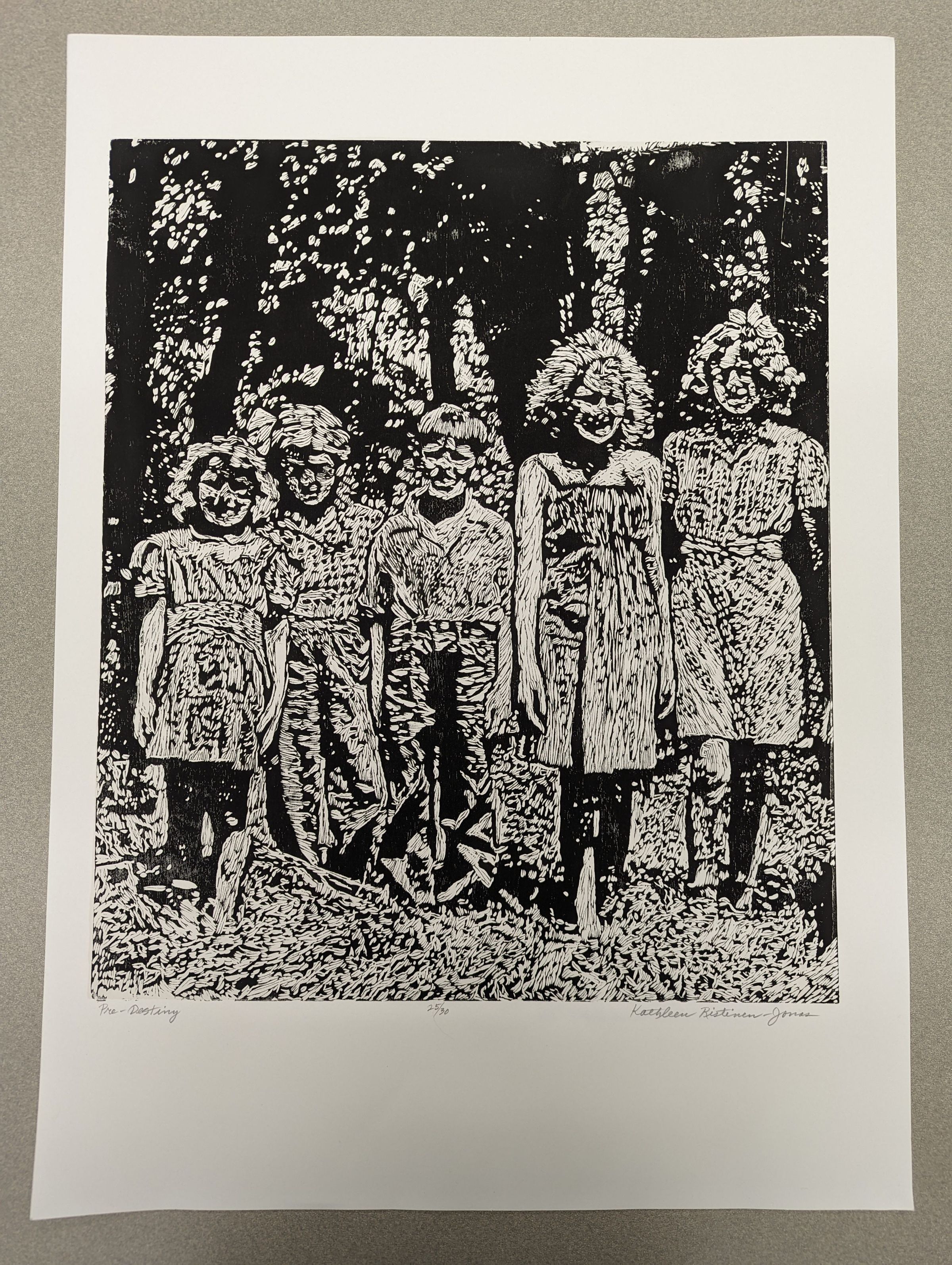A large, vertical, stylized black and white print showing five children lined up for a photo in the outdoors.Context