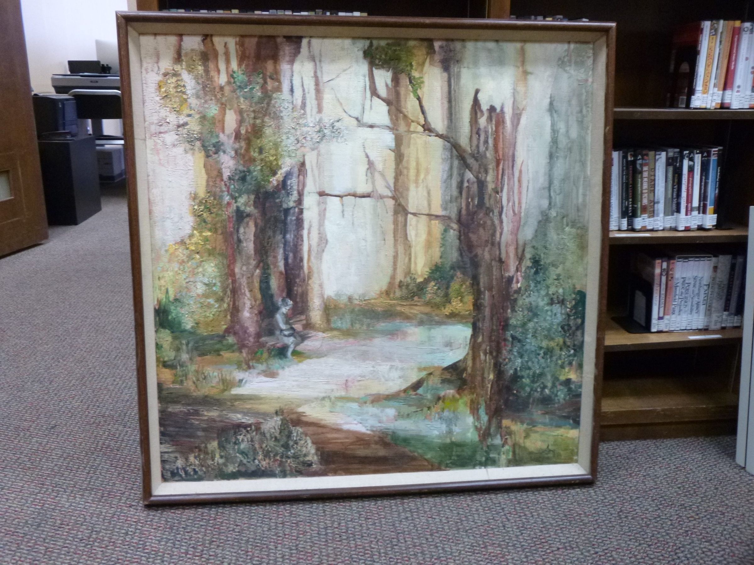 A large vertically-oriented colorful painting of a brightly lit forest.Collection