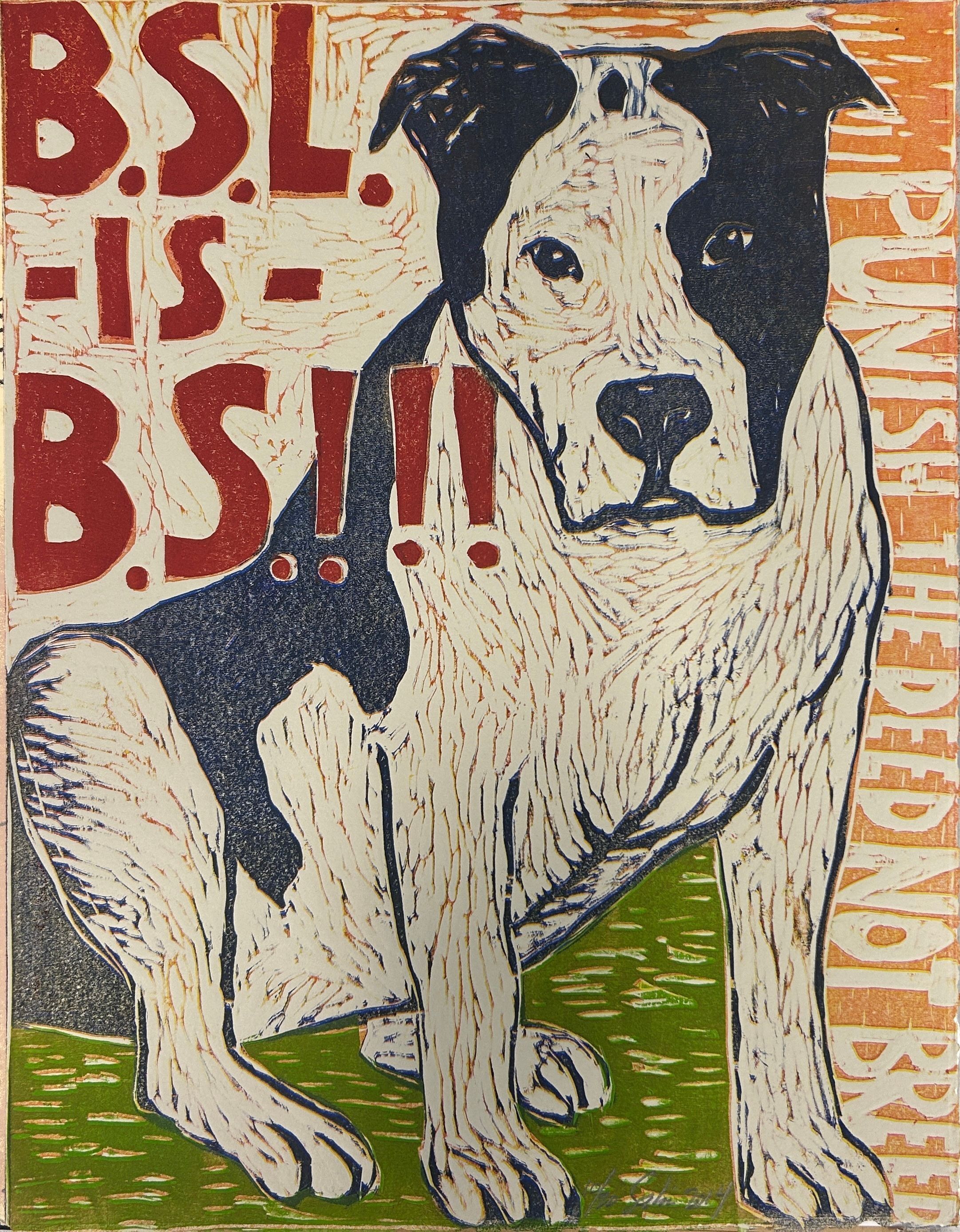 A colorful print on mulberry paper of a pitbull with text over top.Collection