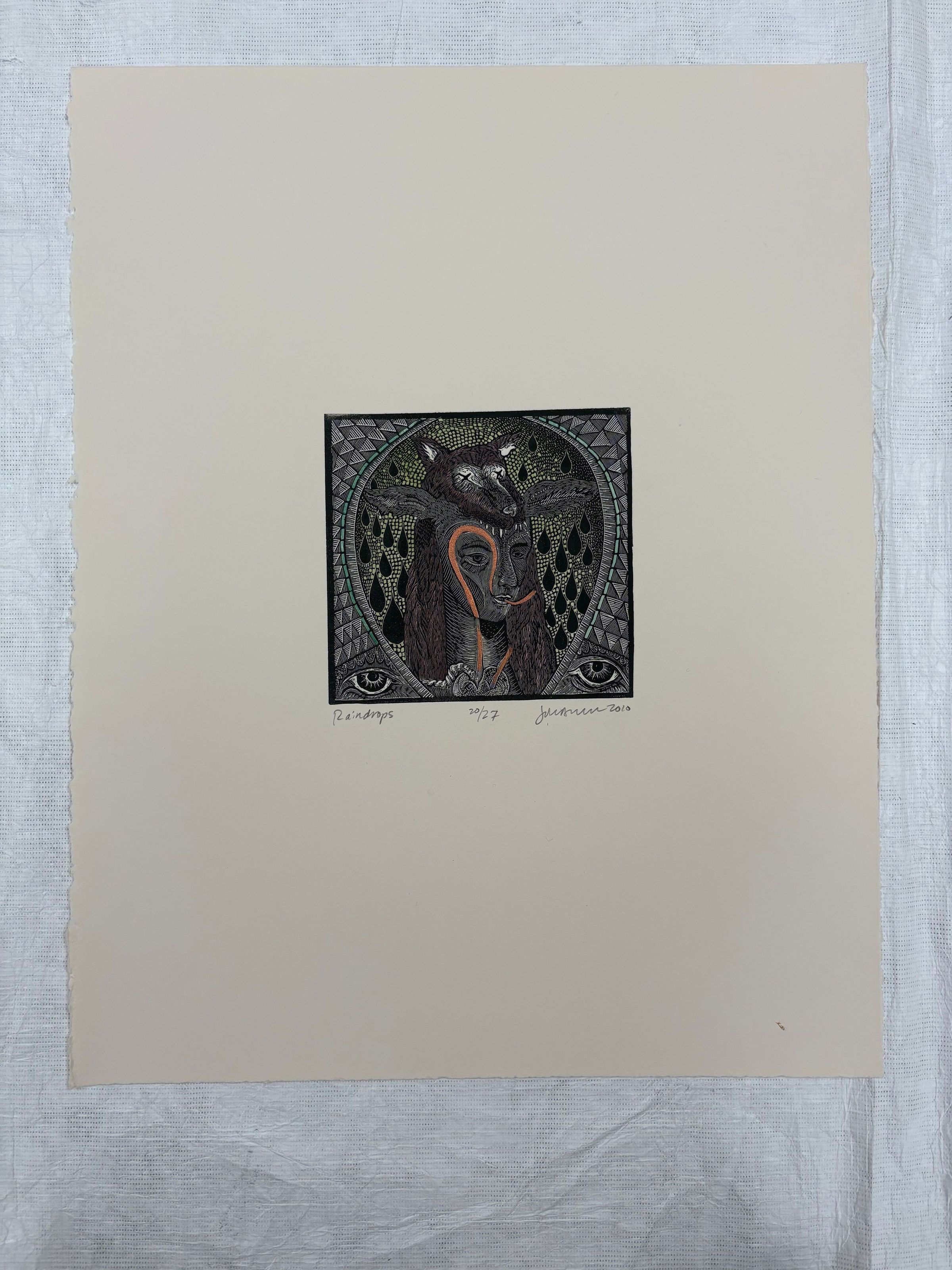 A small print on a medium size piece of paper that is vertically oriented. The print uses colors such as teal, black, orange, brown, to create a central bust that wears an animal skin. This bust has animal like qualities and is surrounded by geometric patterns.Collection