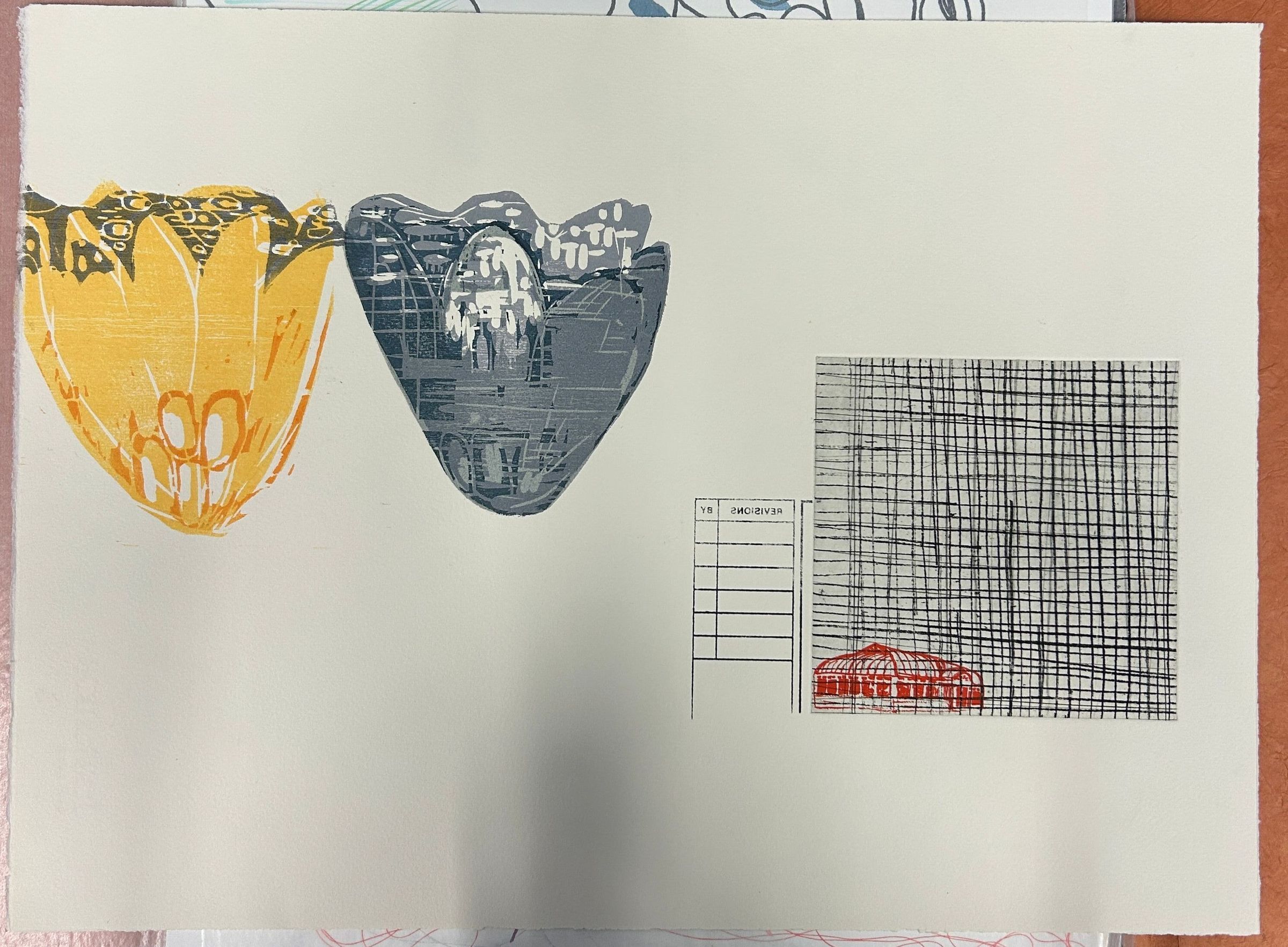 Large print of flowers on the left and a building in a hatched square to the right.Collection