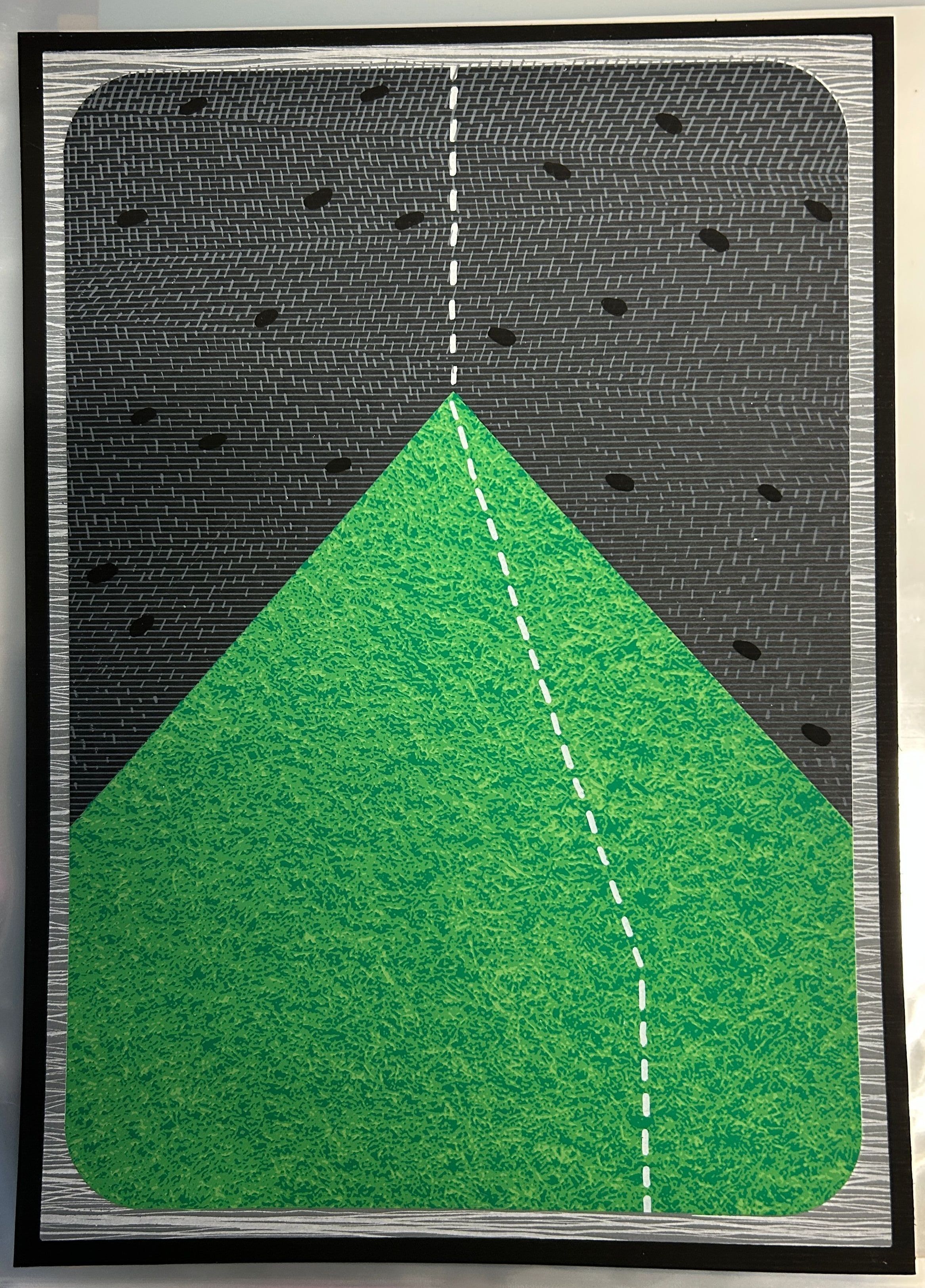 A small print of a green triangle with grass-like texture against a black and gray background. Backside includes information and playbook graphics.Collection