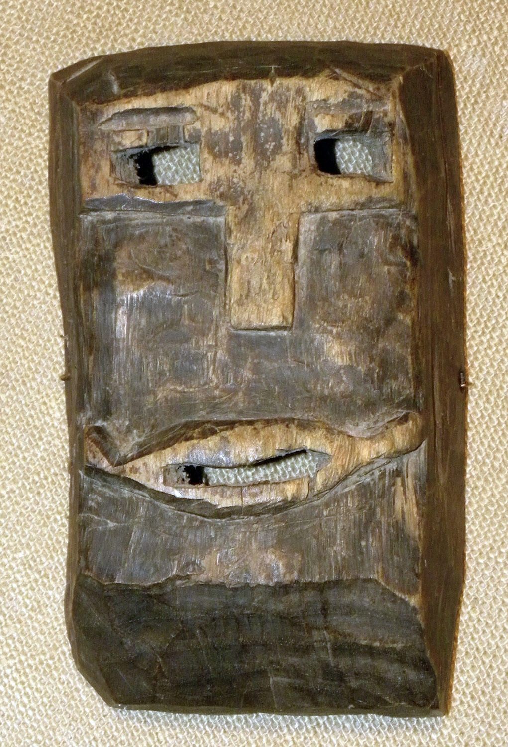 A life-sized rectangular wood mask with geometric features. Cutout rectangular eyeholes are above a geometric nose and a wide, smiling cutout mouth. A wire is attached to the back of the mask.Context