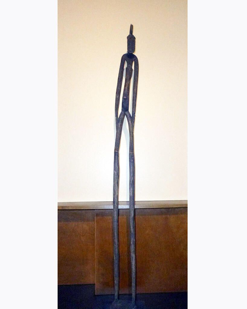 Carved elongated wood figure with carved out eyes, arms, legs, torso, and facial features.Collection