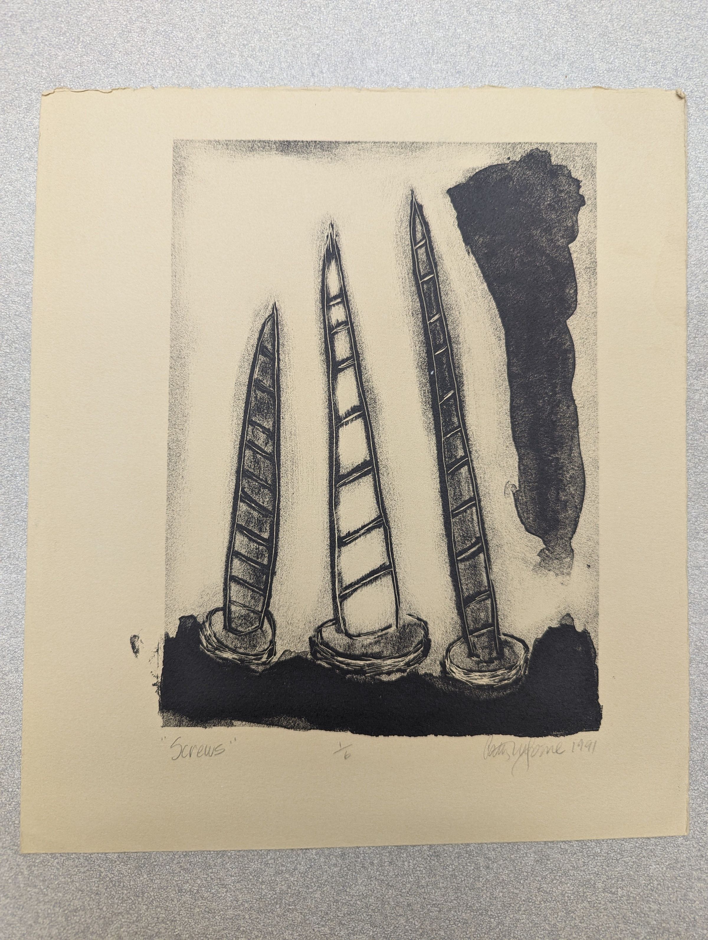 A vertical print showing three large screws of slightly different shapes and sizes placed next to each other on a smudged black surface. To the right of them is a long black smudge going up the page.Context