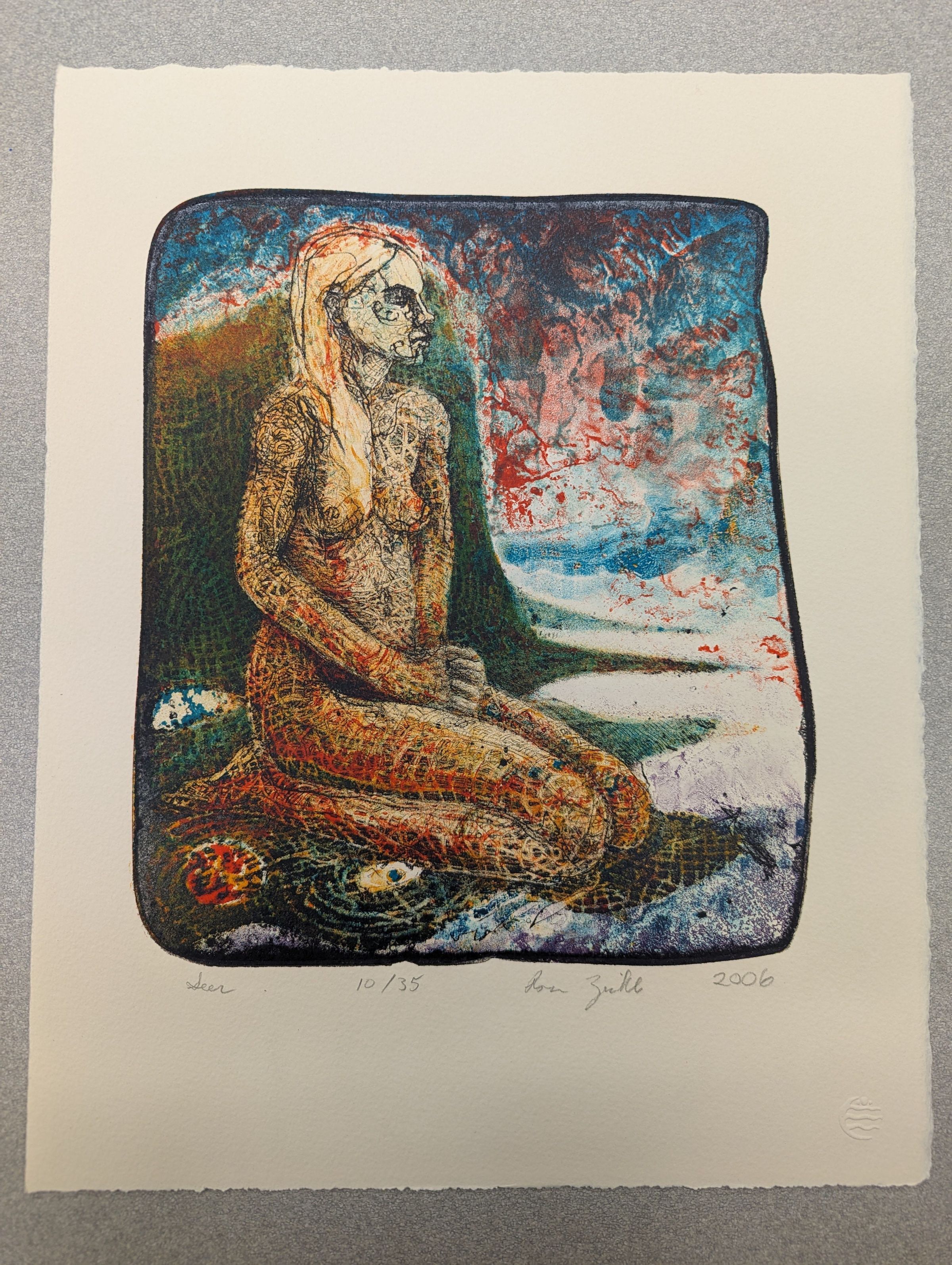A vertical print depicting a heavily abstracted scene - a naked woman kneeling, made of tan or wicker material, in a green and white landscape with a blue sky. Red pigment stains the whole scene in whorls.Context