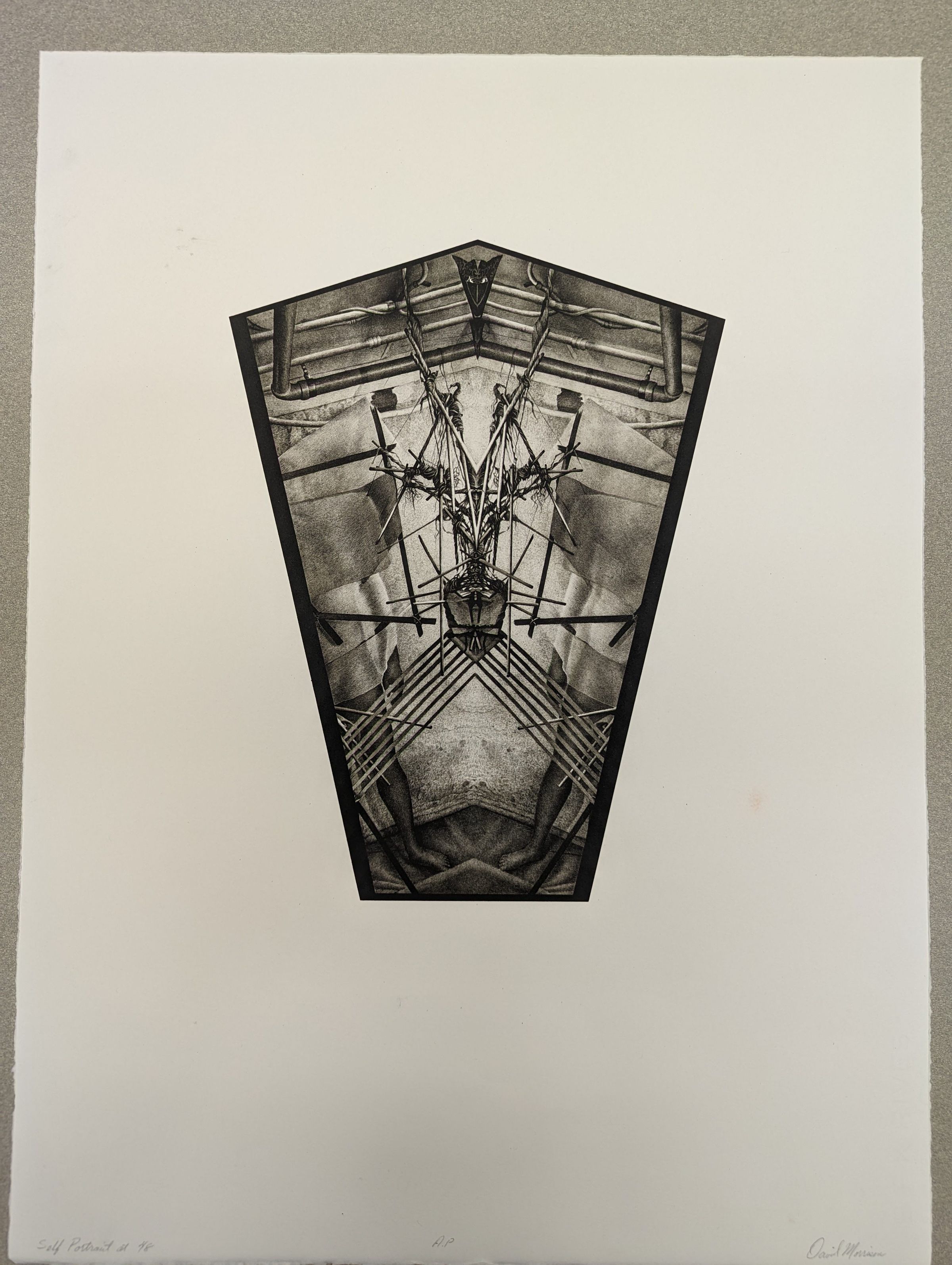 A large lithographic print in black and white on deckle edged paper. The central image is a bounded pentagonal shape with a kaleidoscopic scene inside of it, centering a complex assemblage of rods tied with hair or a similar fiber. It is suspended from a series of pipes above, and flanking it reflected on each side is the image of a standing person, their top half obscured by canvas.Context