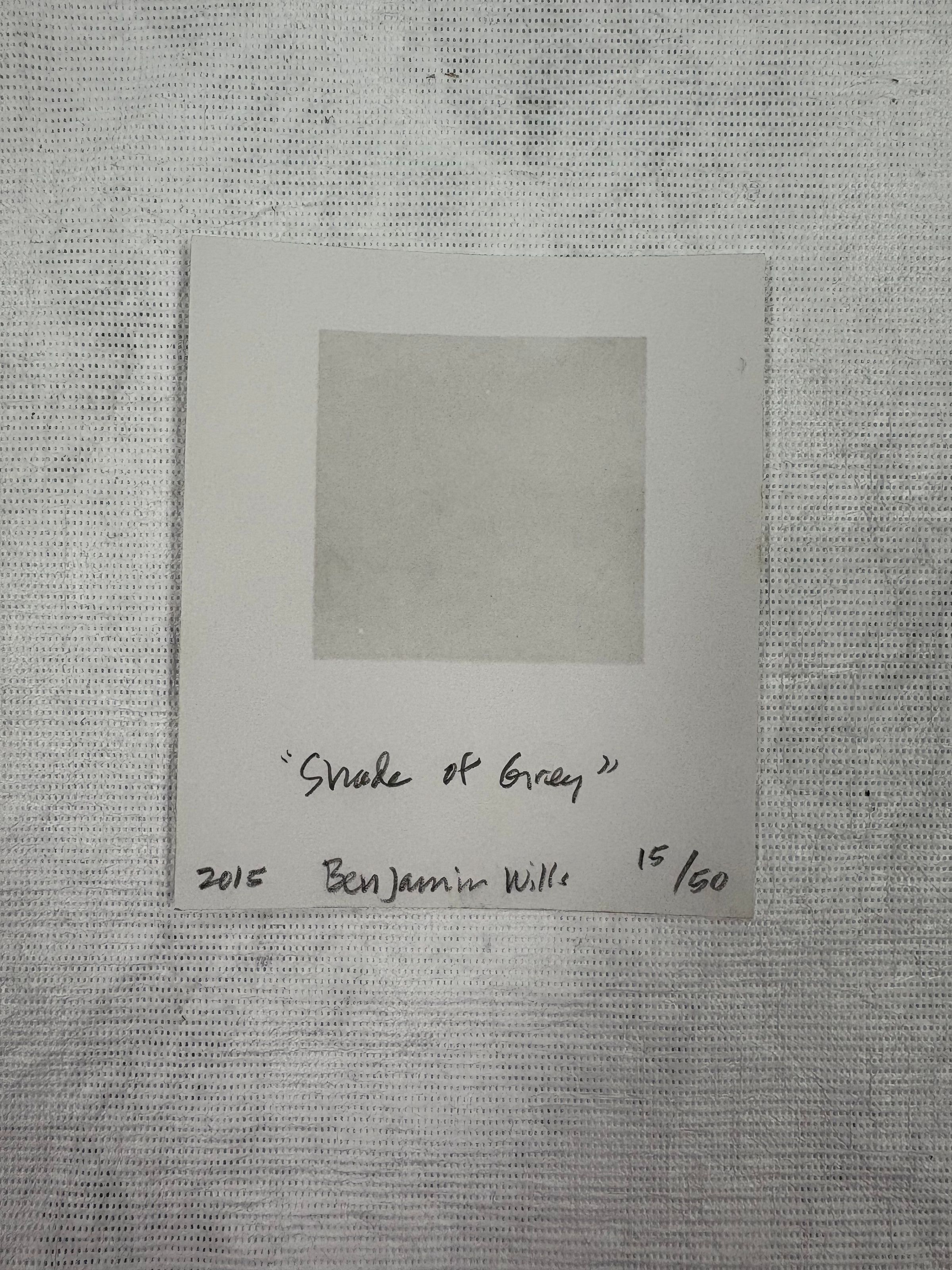 A small, vertically oriented print that has a minimalistic color scheme of grey pigment on a white ground. At the center of this print is a grey square with no other imagery or text.Collection