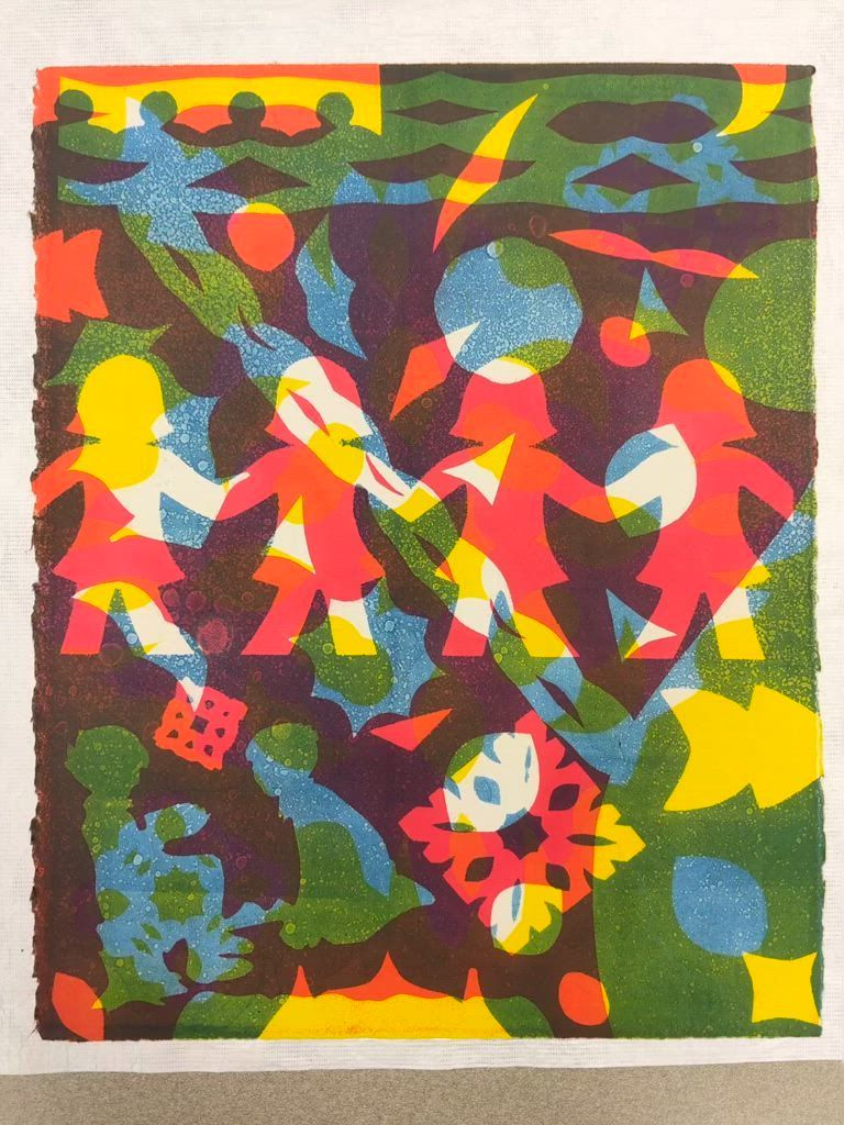 A medium sized, vertically oriented print that uses multiple colors. At the center of a print is a string of silhouettes of girls holding hands, around them are various shapes and designs that take up the entirety of the page.Collection