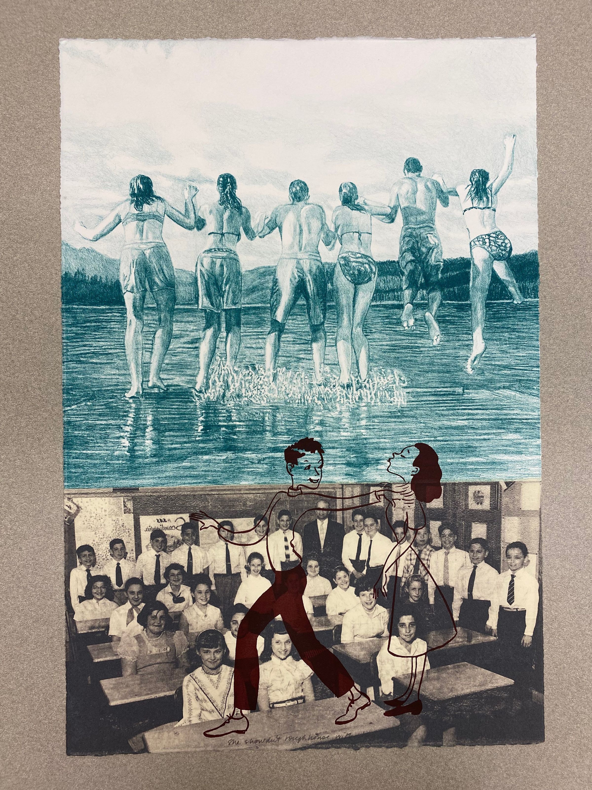 A large vertically oriented print depicting two panels with vastly different styles. The top panel appears to be created by hand in blue, depicting a group of people leaping into water with their back turn away from the viewer. The lower portion of the composition is of a black and white photograph of school children in a class room. Two figures overlap both panels showing a feminine and masculine figure interacting in a dynamic manner.Collection